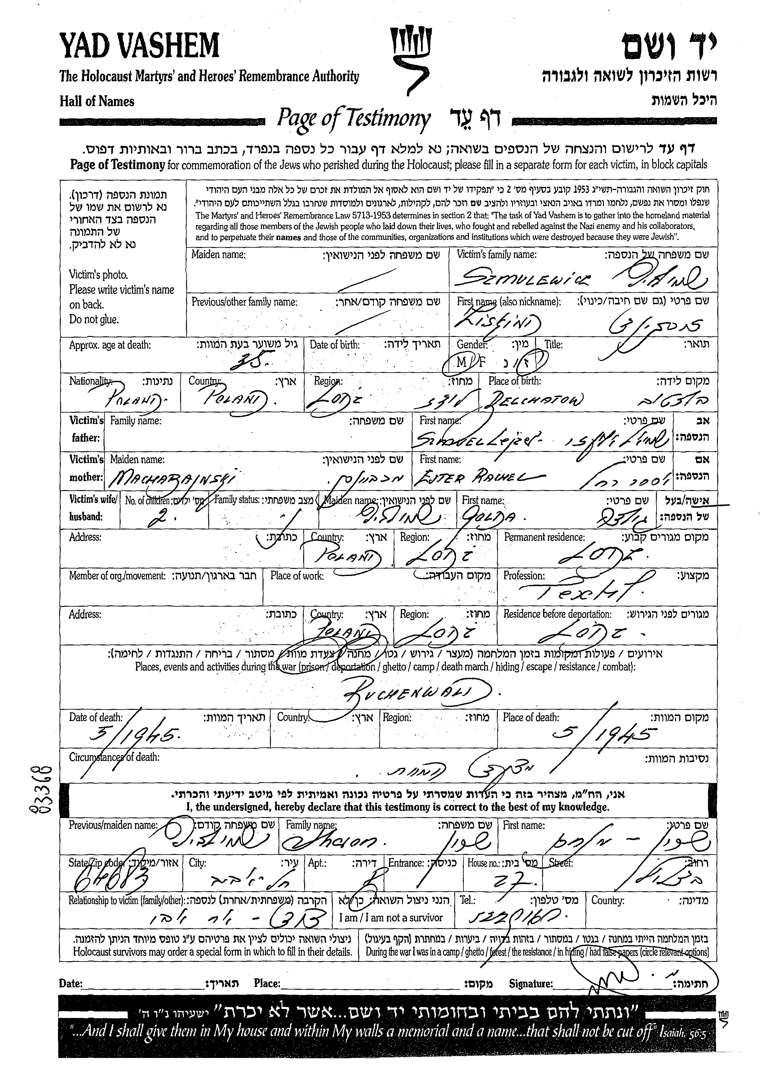 Шмулевиц Зискинд Лодзь, Польша Лист свидетельских показаний