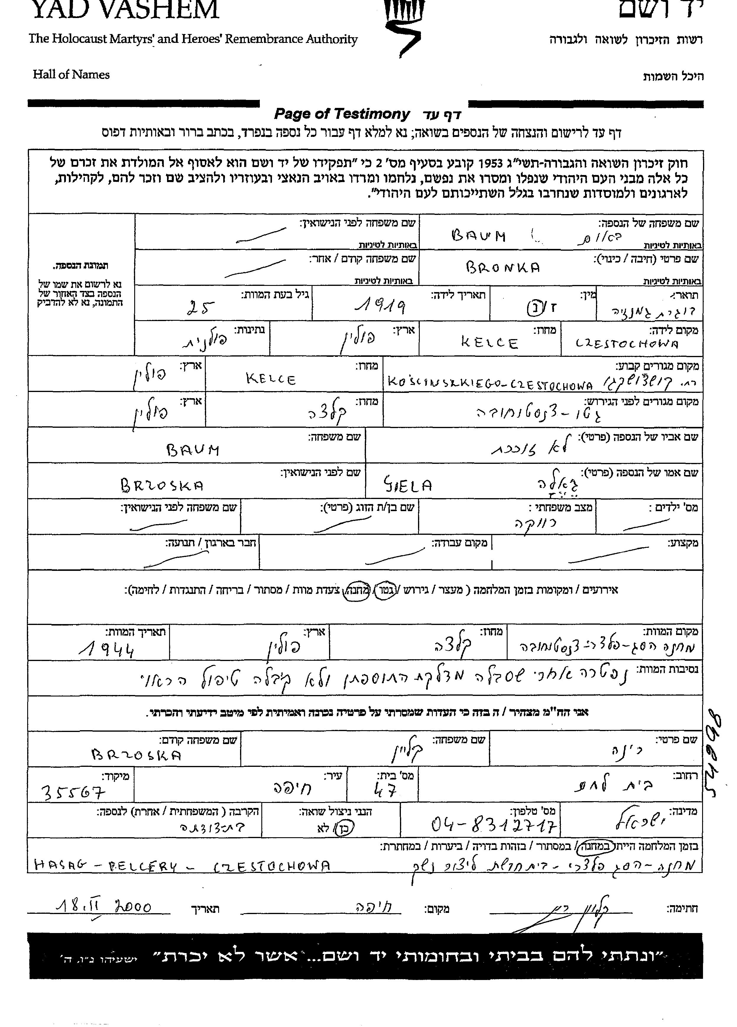 Баум Бронка 1919 Ченстохова, Польша Лист свидетельских показаний
