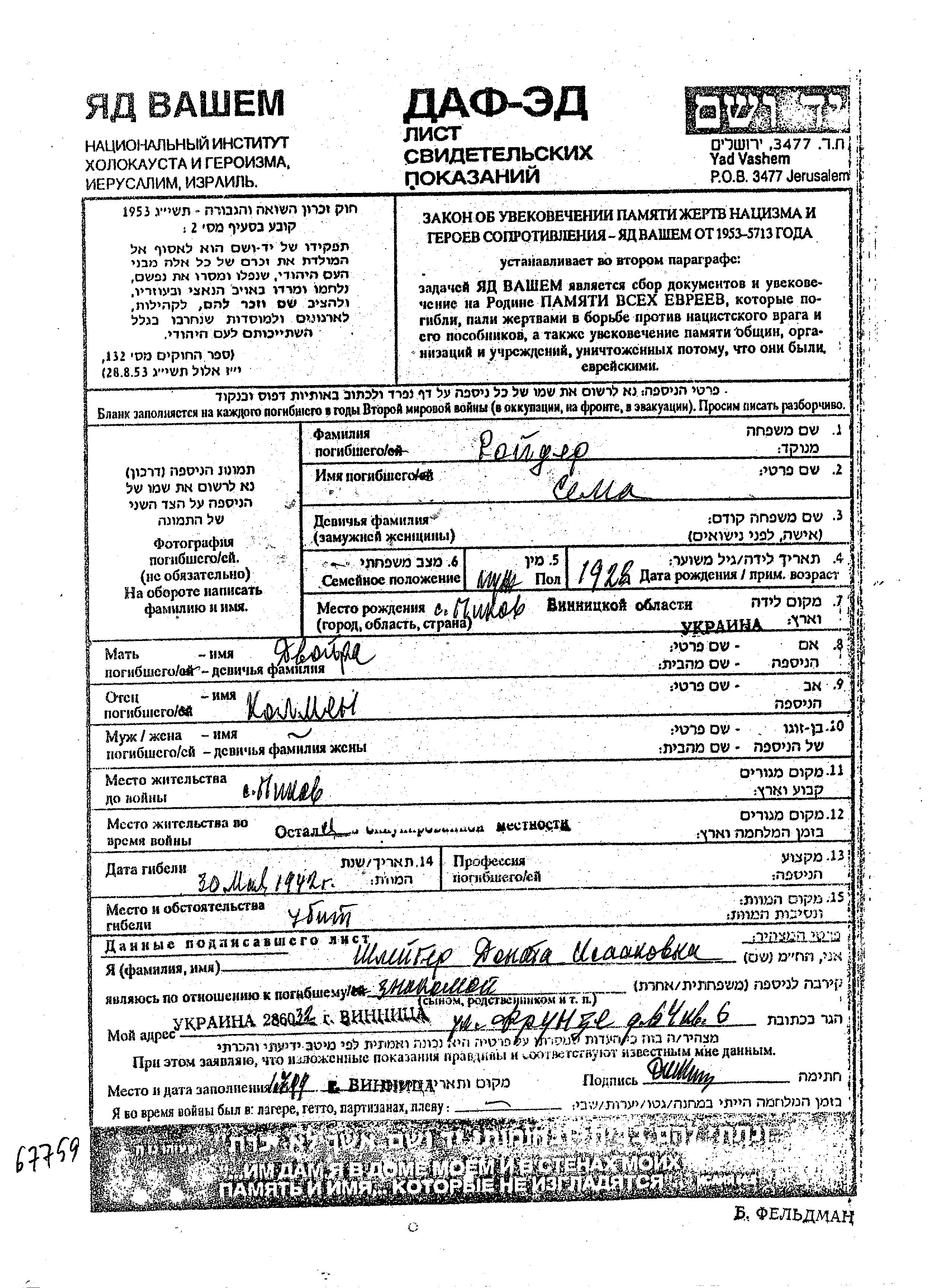Яд Вашем - Листы свидетельских показаний Мемориального фонда