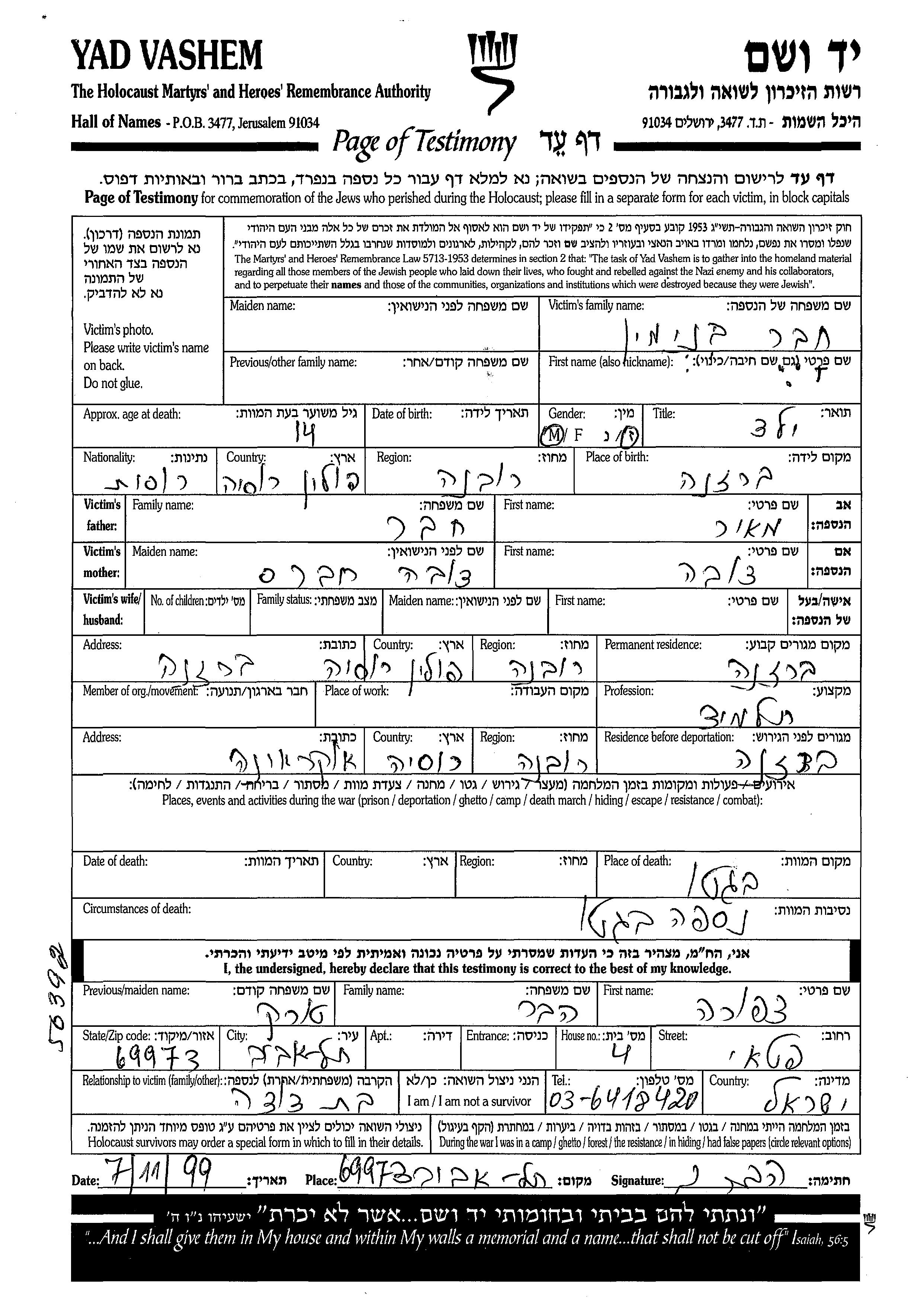 Яд Вашем - Листы свидетельских показаний Мемориального фонда