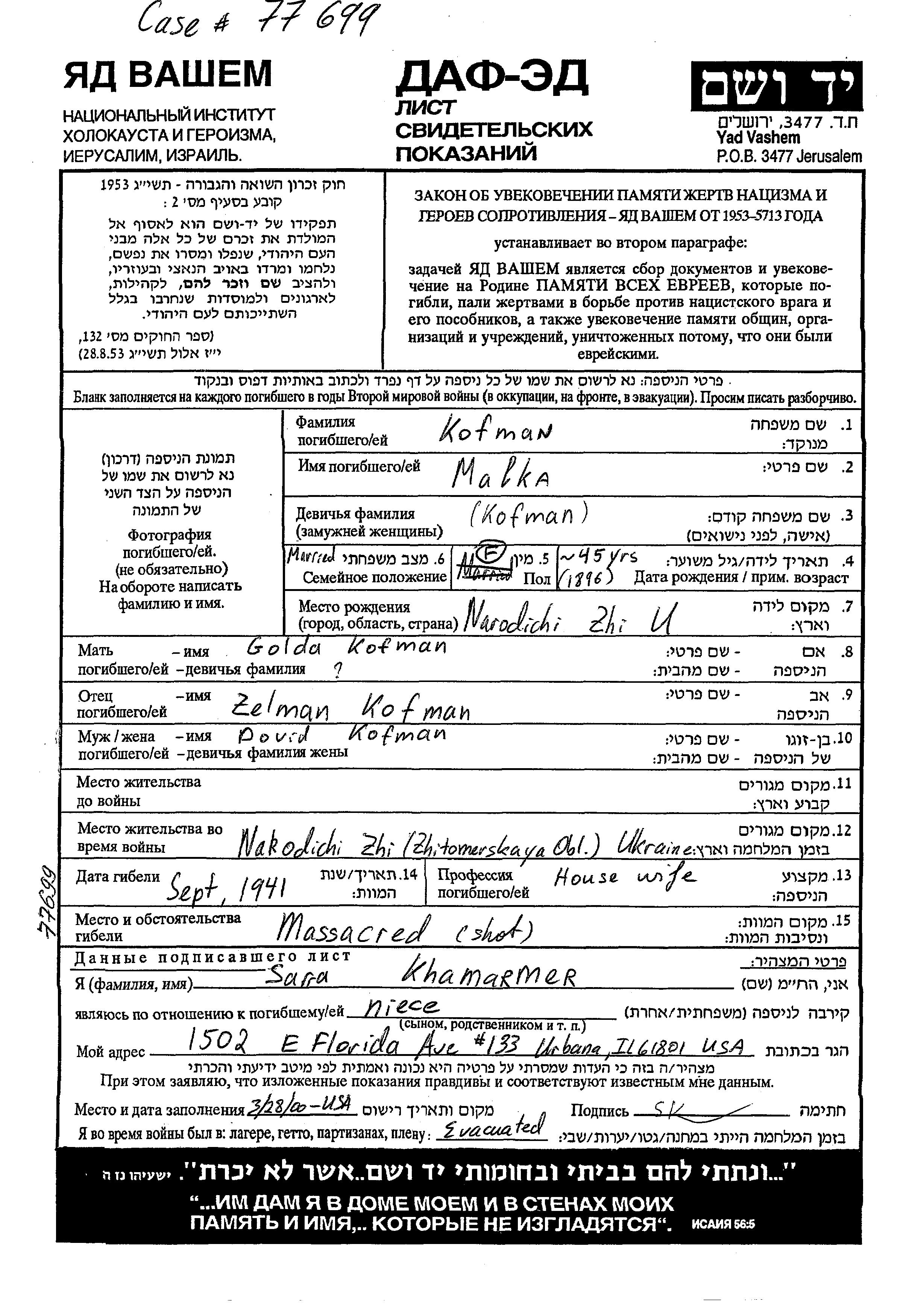 Малка Кофман, место рождения: Народичи, Украина (СССР). Отец: Зельман, mать:Голда. Домохозяйка. Женат / замужем. Место во время войны: Народичи, Украина (СССР).