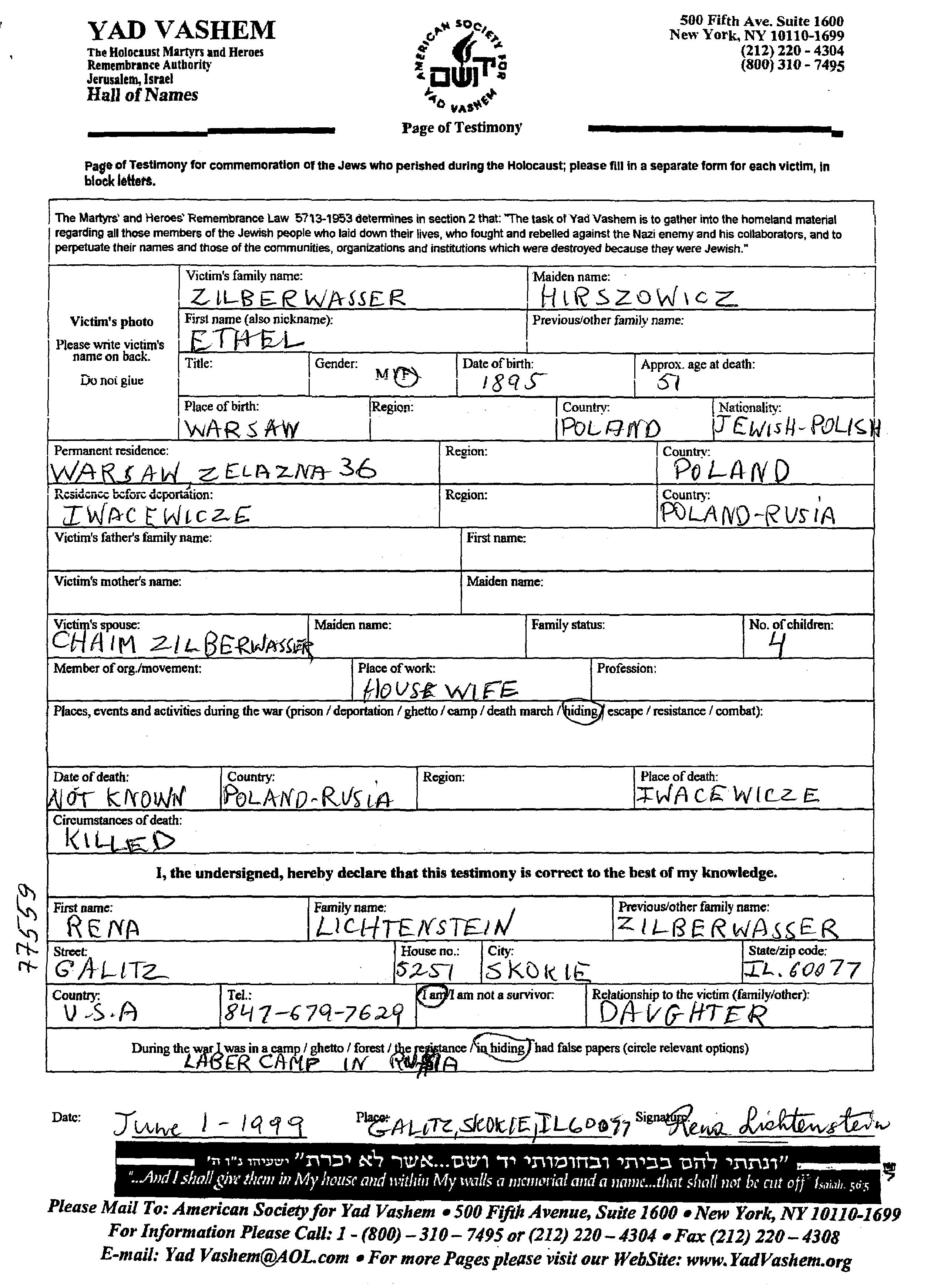 Этель Зильбервассер, девичья фамилия Хиршович, место рождения: Варшава, Польша. Женат / замужем. Место жительства до войны: Варшава, Польша. Место во время войны: Ивацевичи, Польша.
