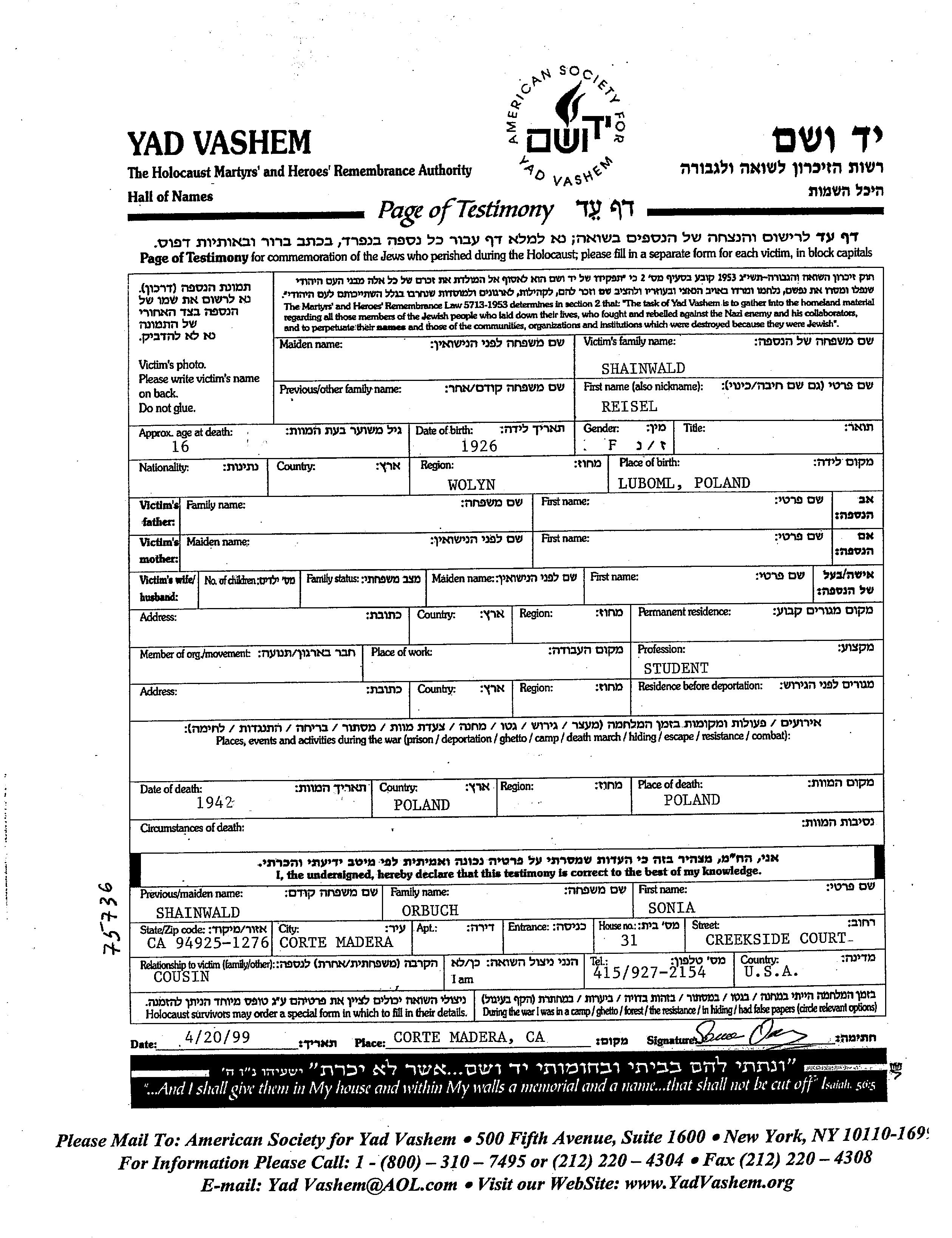 Яд Вашем - Листы свидетельских показаний Мемориального фонда