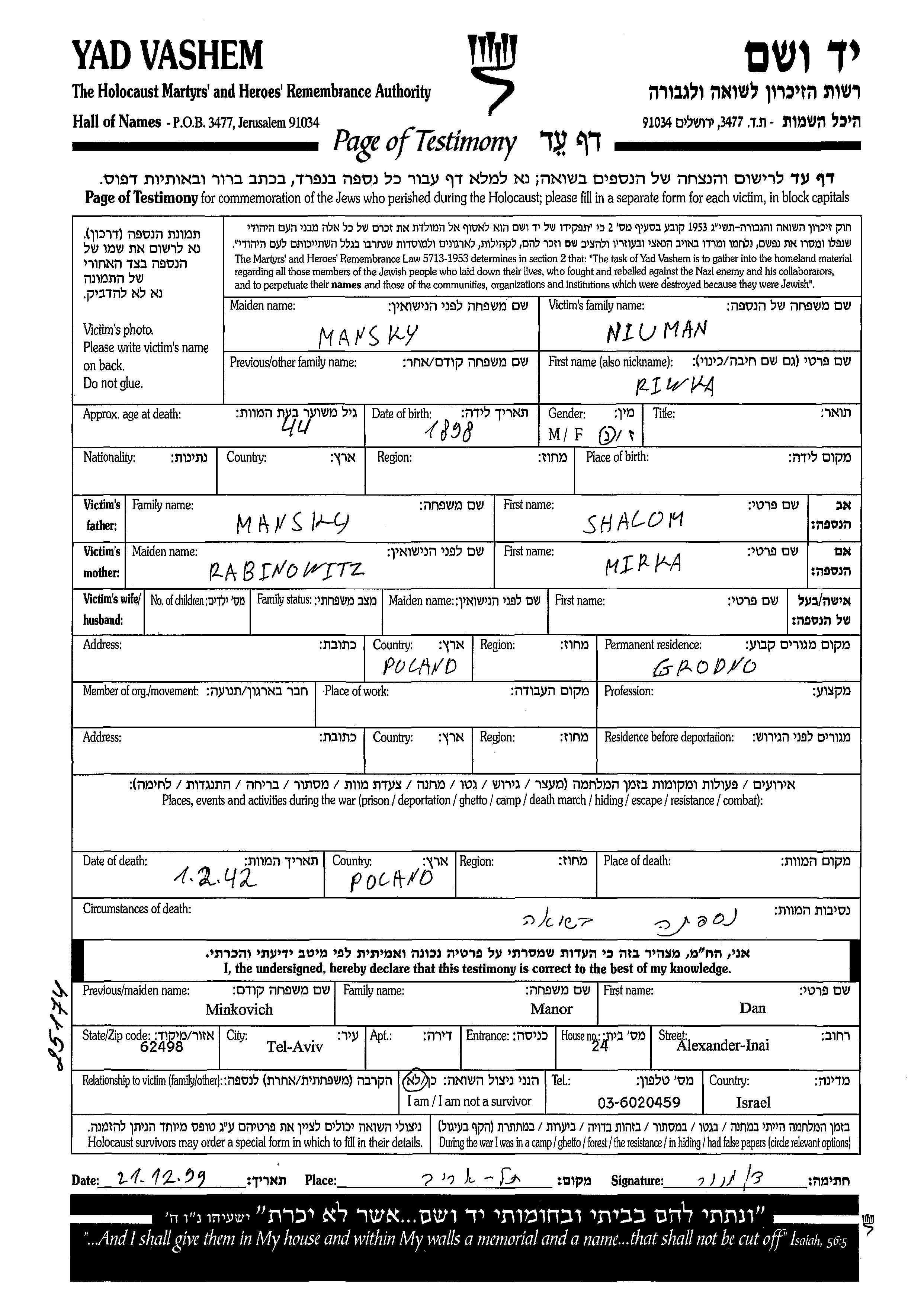 Ривка Нюман, девичья фамилия Мански. Отец: Шалом, mать:Мирка. Место жительства до войны: Гродно, Польша.