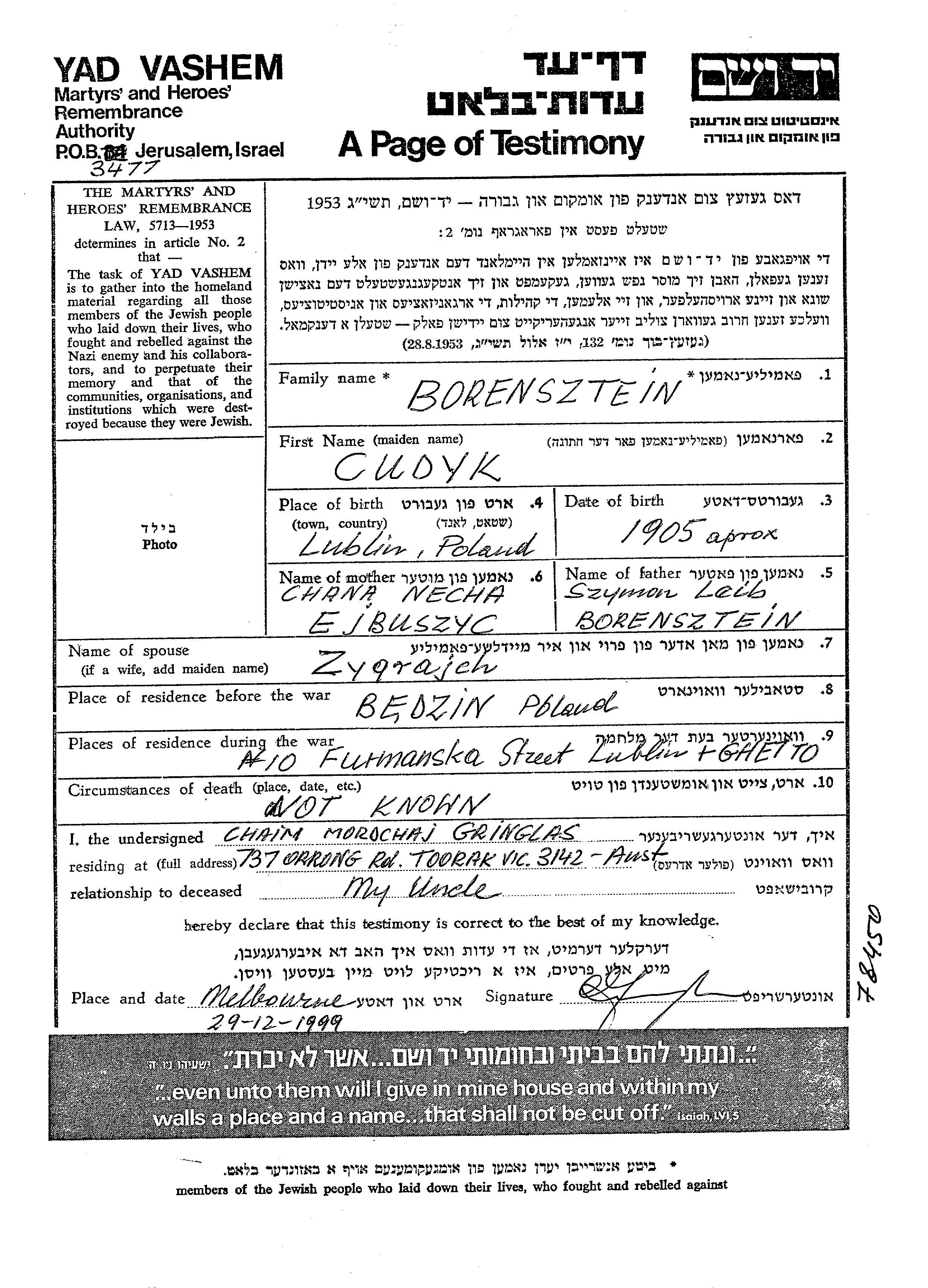Цудик Боренштейн, место рождения: Люблин, Польша. Отец: Шимон Лейб, mать:Хана Неха. Место жительства до войны: Бендзин, Польша. Место во время войны: Люблин, Польша.