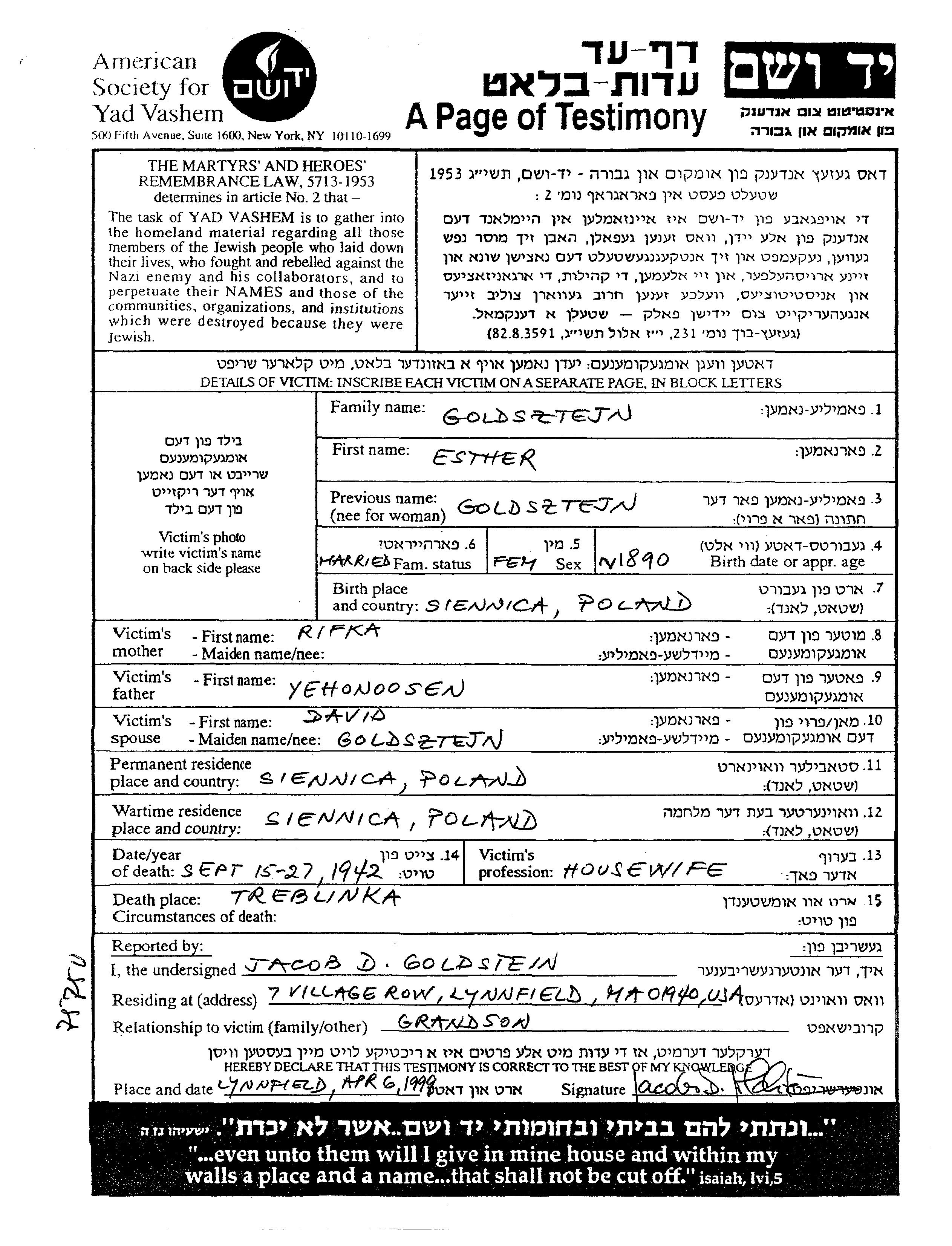 Эстер Гольдштейн, место рождения: Сенница, Польша. Отец: Ехонусен, mать:Рифка. Домохозяйка. Женат / замужем. Место жительства до войны: Сенница, Польша. Место во время войны: Сенница, Польша.
