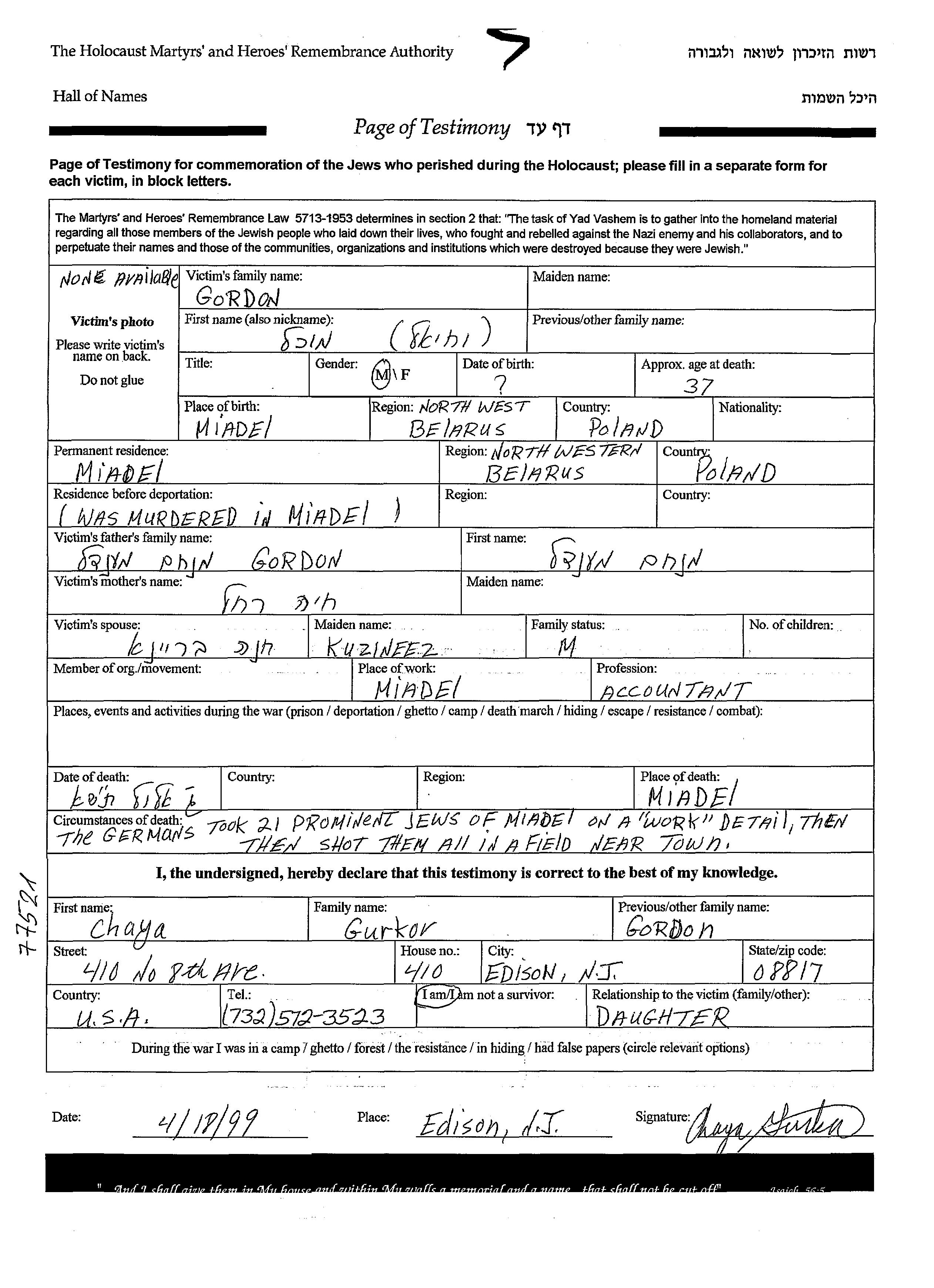 Михель Иехиэль Гордон, место рождения: Мядзиол Старый, Польша. Отец: Менахем Мендл, mать:Хая. Бухгалтер / счетовод. Место жительства до войны: Мядзиол Старый, Польша. Место во время войны: Мядзиол Старый, Польша.