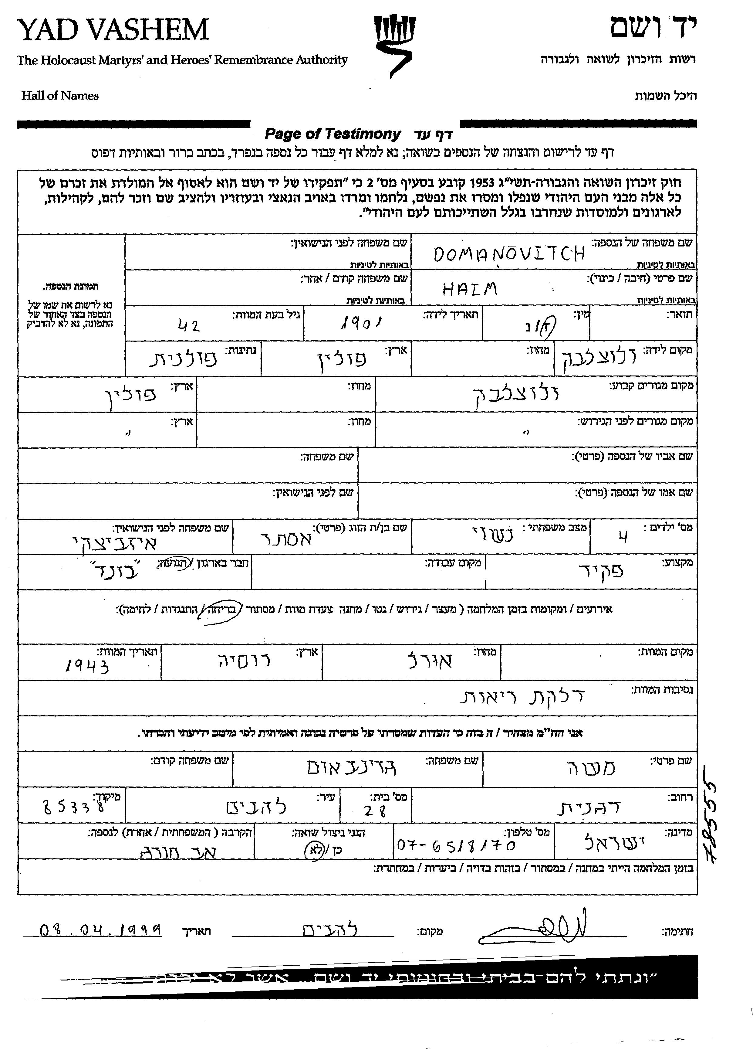 Хаим Доманович, место рождения: Влоцлавек, Польша. Клерк. Женат / замужем. Место жительства до войны: Влоцлавек, Польша. Место во время войны: Влоцлавек, Польша.