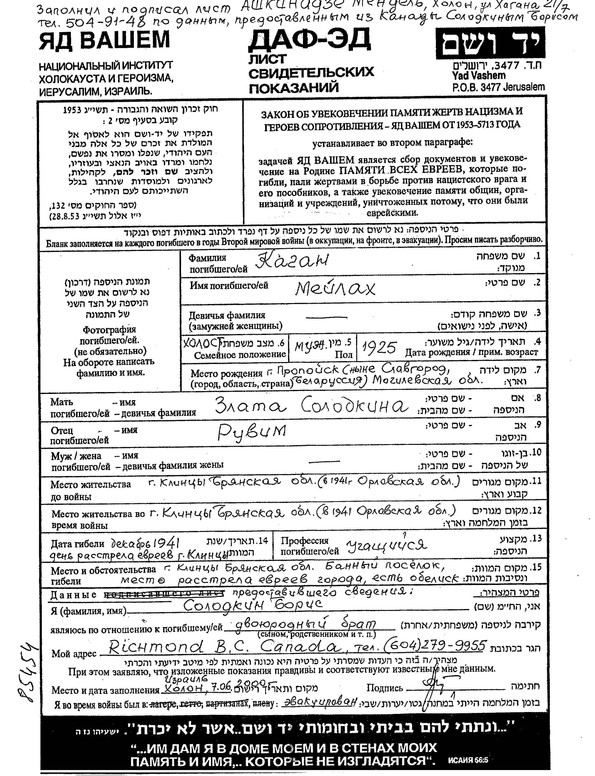 Каган Мейлах 1925 Клинцы, Россия (СССР) Лист свидетельских показаний