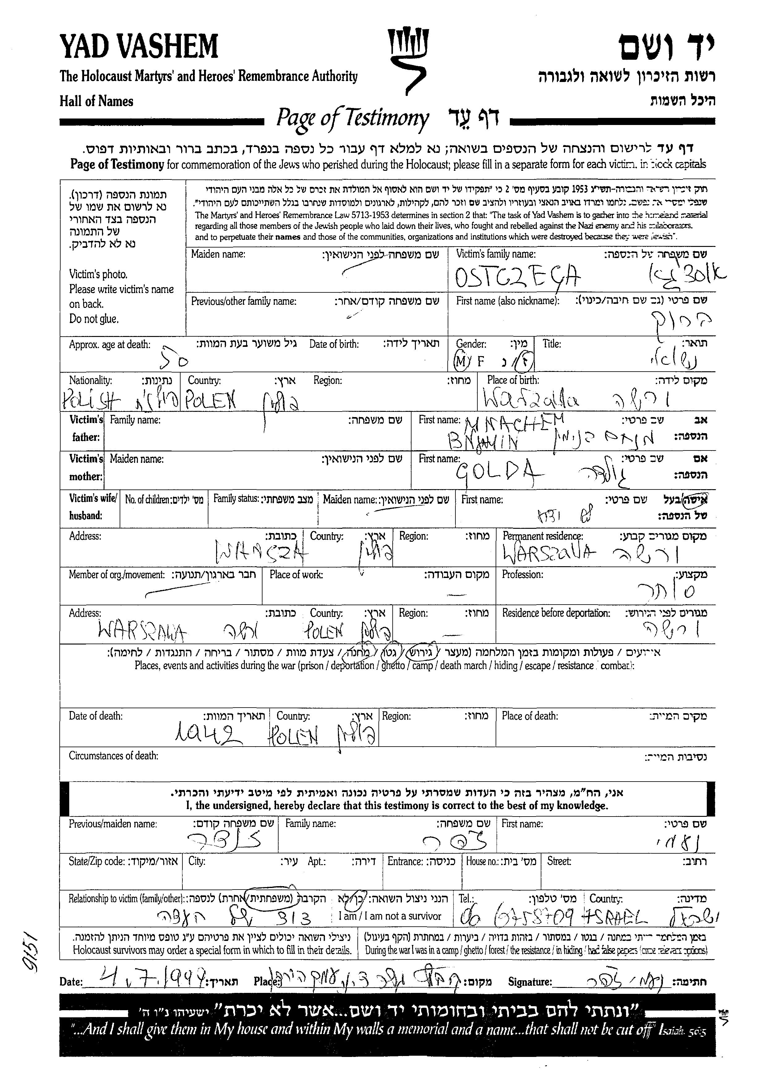 Барух Остчега, место рождения: Варшава, Польша. Отец: Менахем Беньямин, mать:Голда. Торговец / торговка. Женат / замужем. Место жительства до войны: Варшава, Польша. Место во время войны: Варшава, Польша.