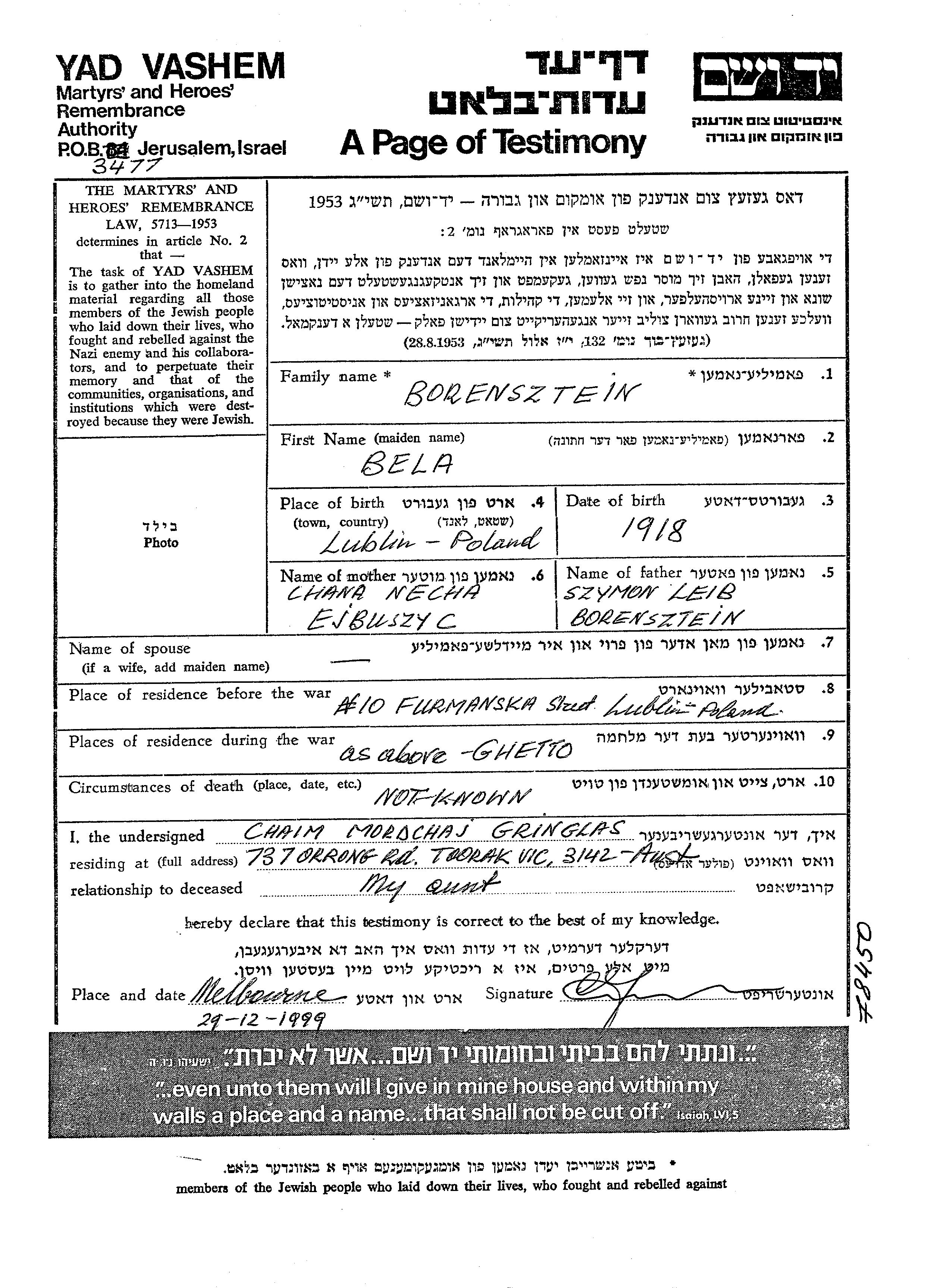 Боренштейн Бела 1918 Люблин, Польша Лист свидетельских показаний