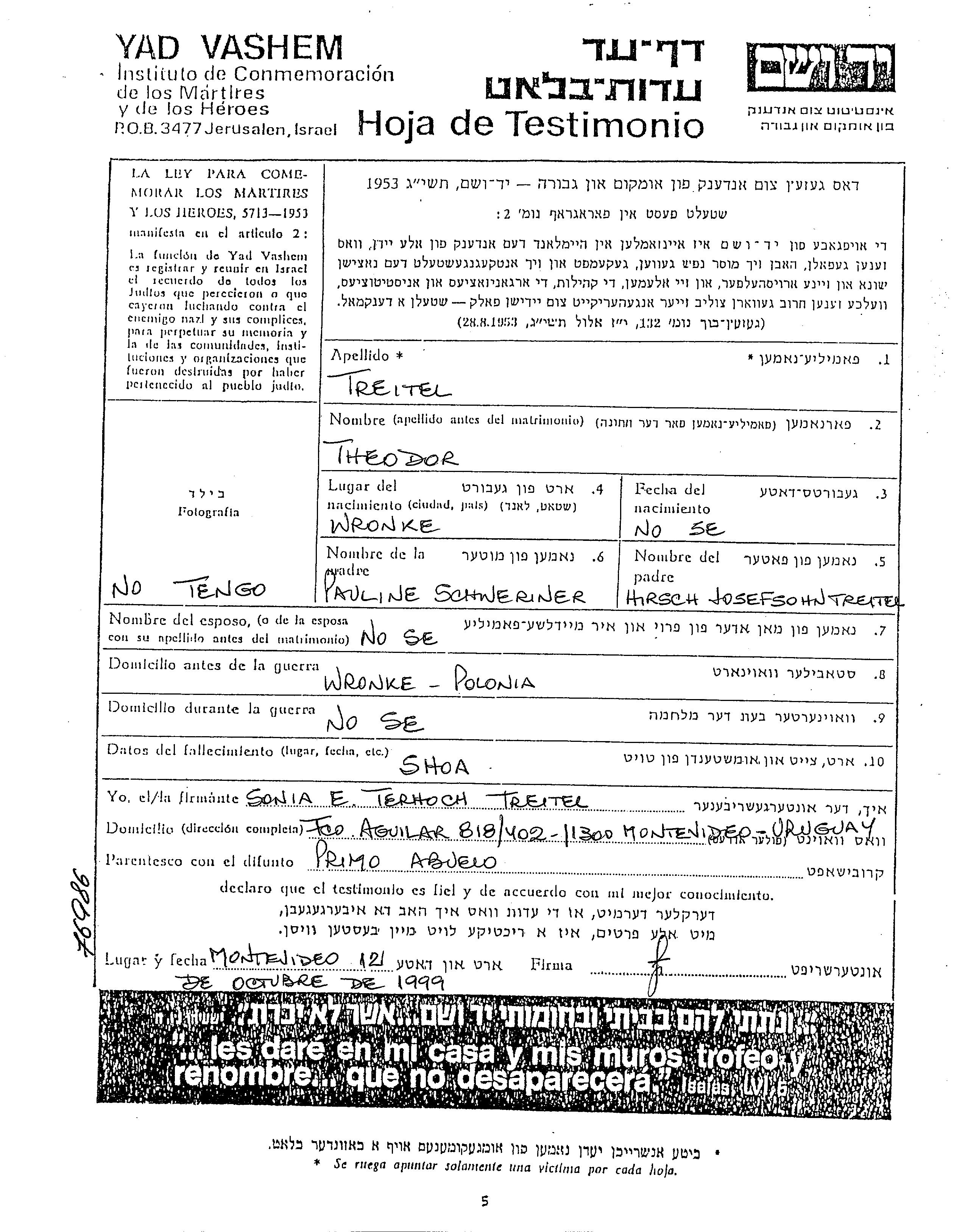 Теодор Трайтель, место рождения: Вронке, Польша. Отец: Гирш, mать:Паулине. Место жительства до войны: Вронке, Польша.