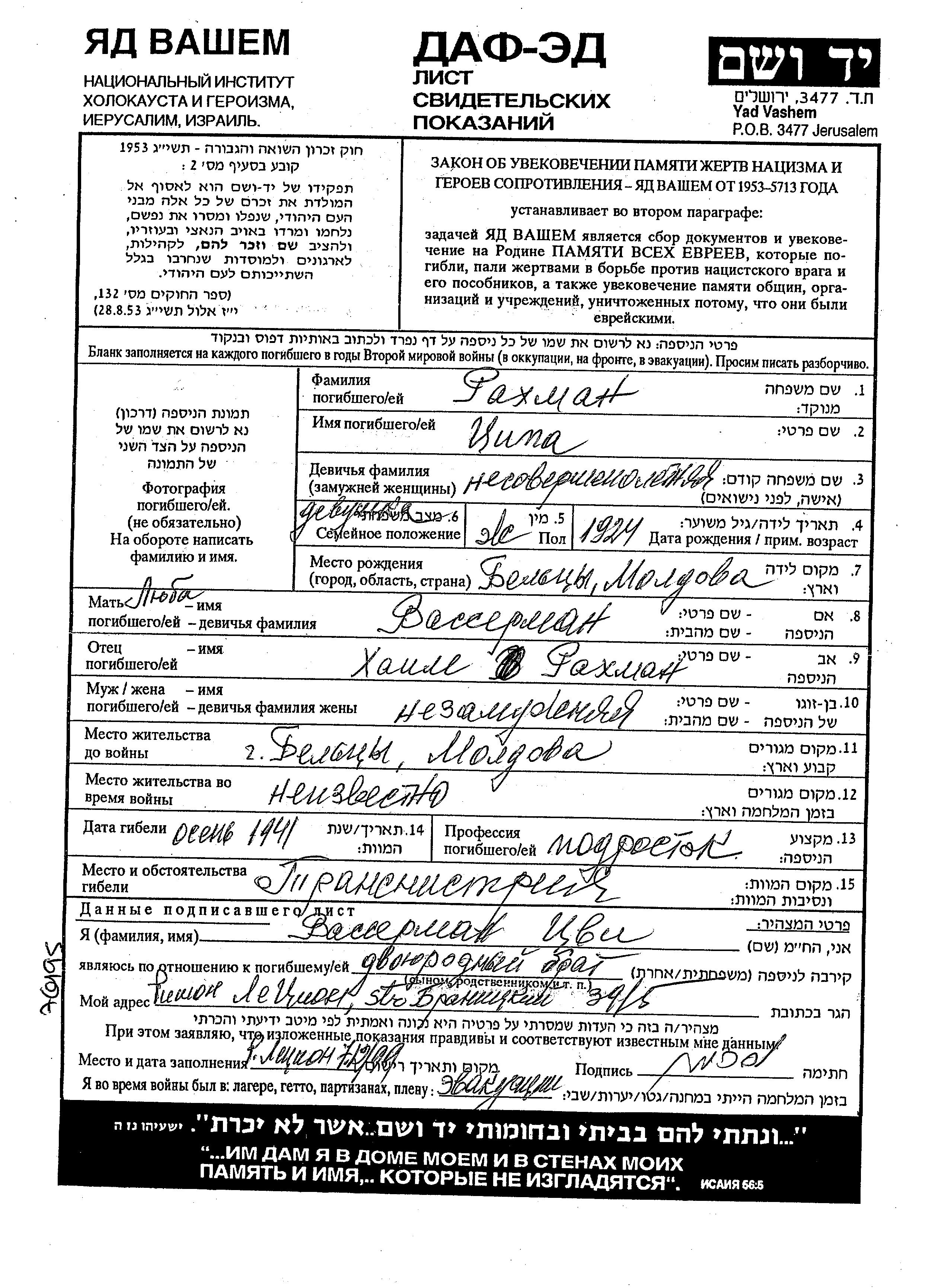 Яд Вашем - Листы свидетельских показаний Мемориального фонда
