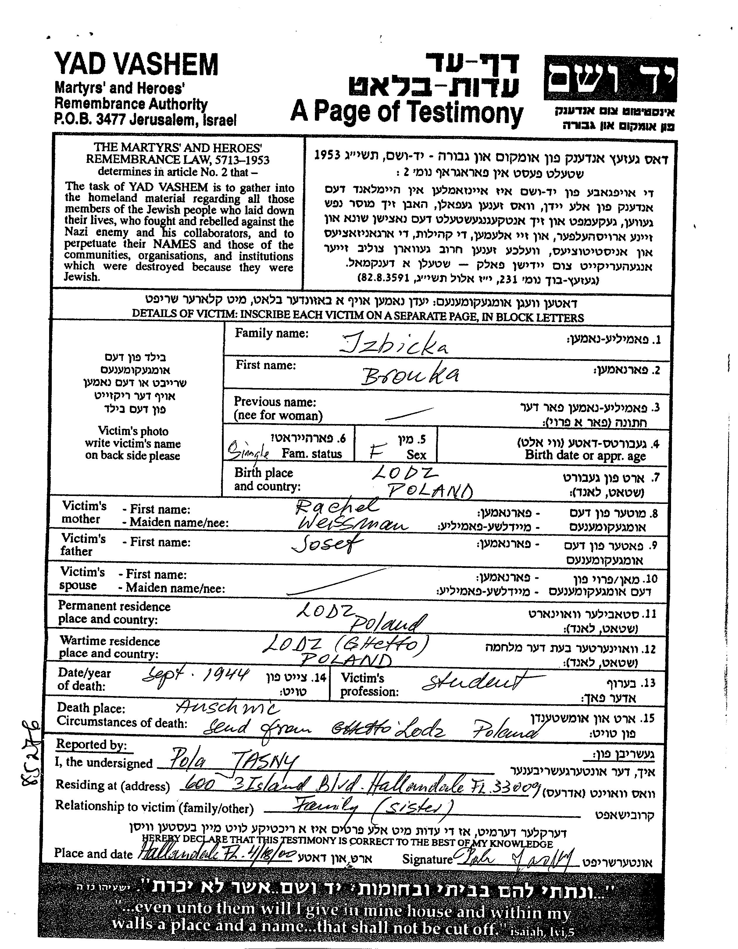 Избицка Браха Лодзь, Польша Лист свидетельских показаний