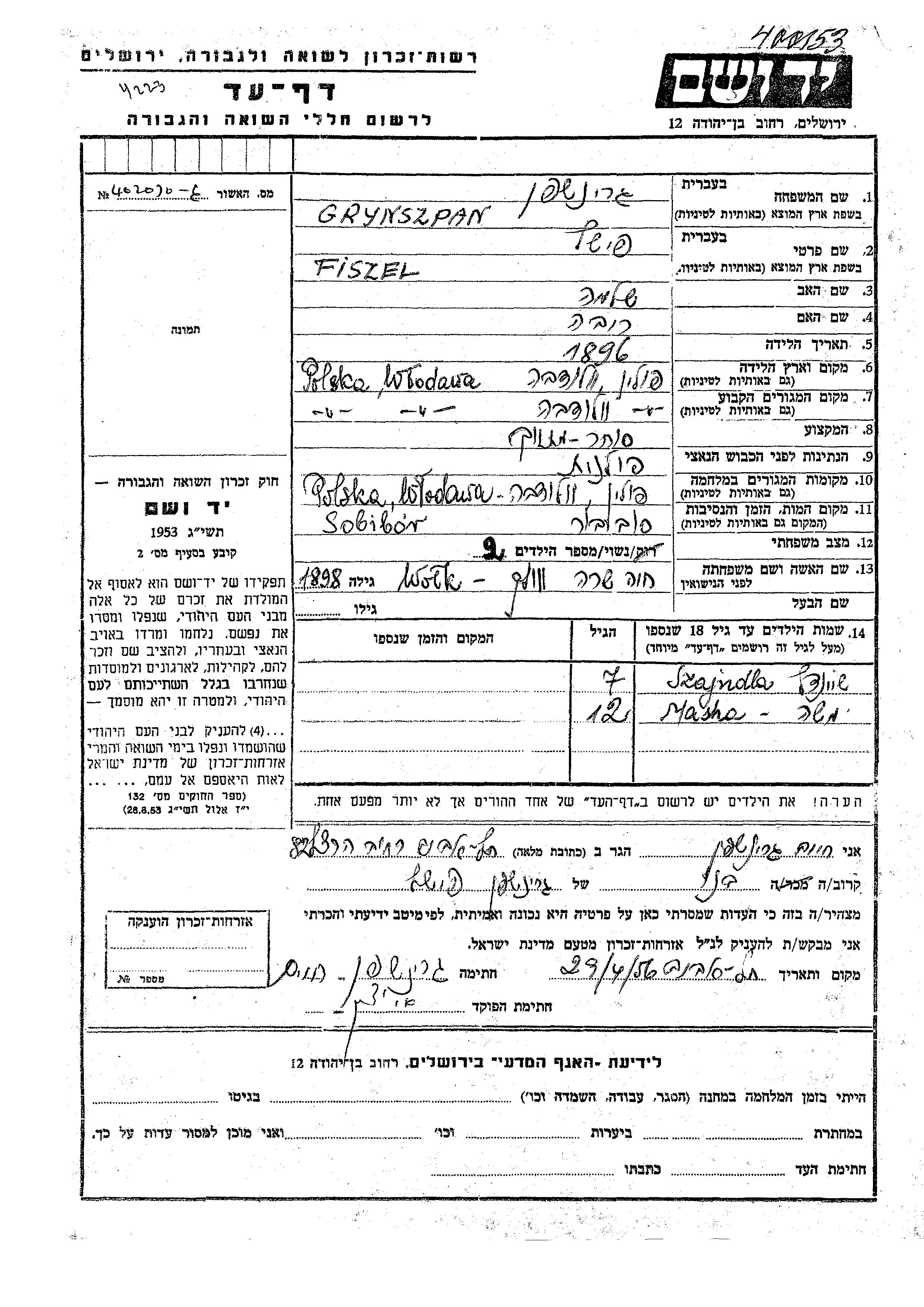 Гриншпан Фишель 1896 Влодава, Польша Лист свидетельских показаний