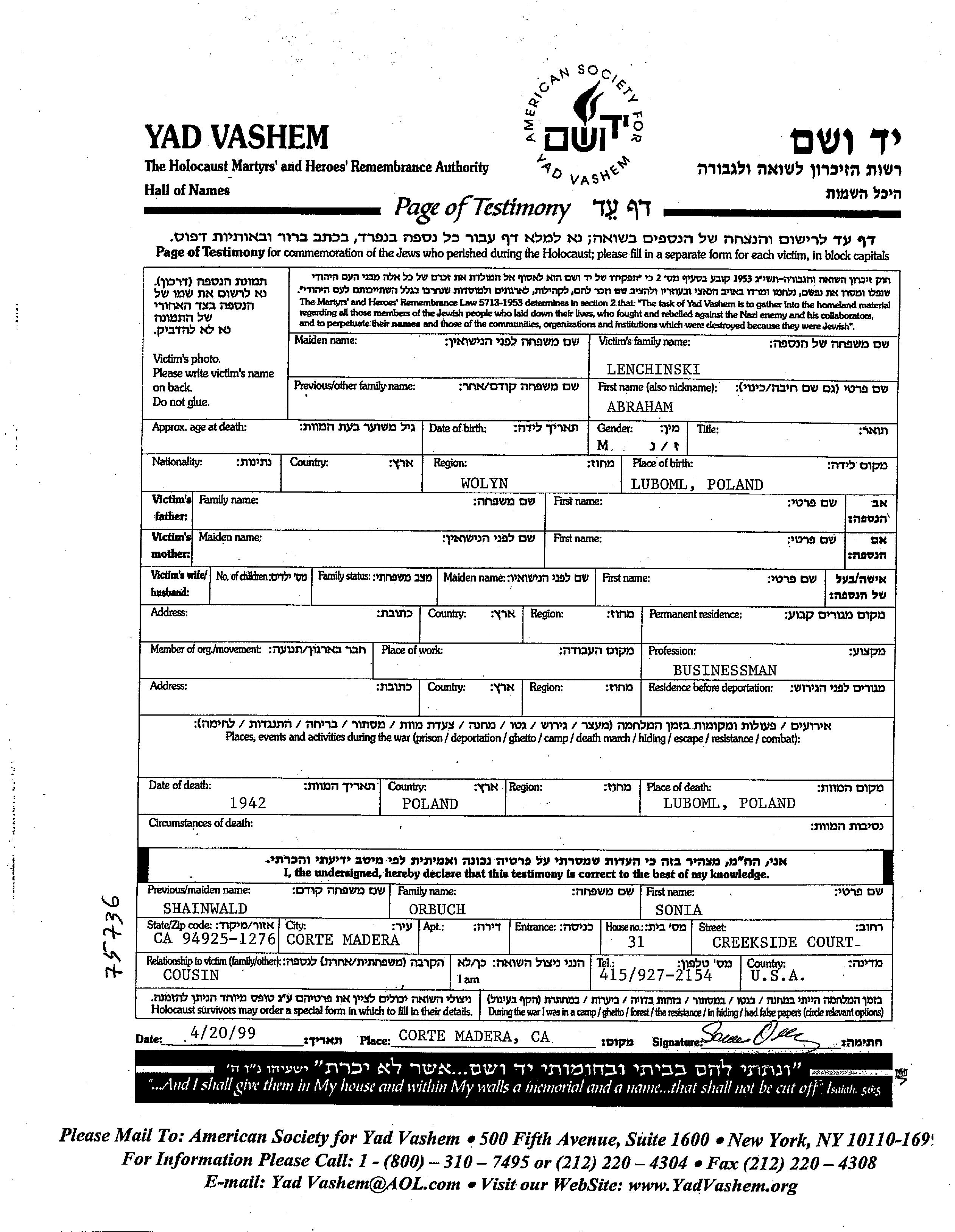Ленчински Абраам место не указано, Лист свидетельских показаний