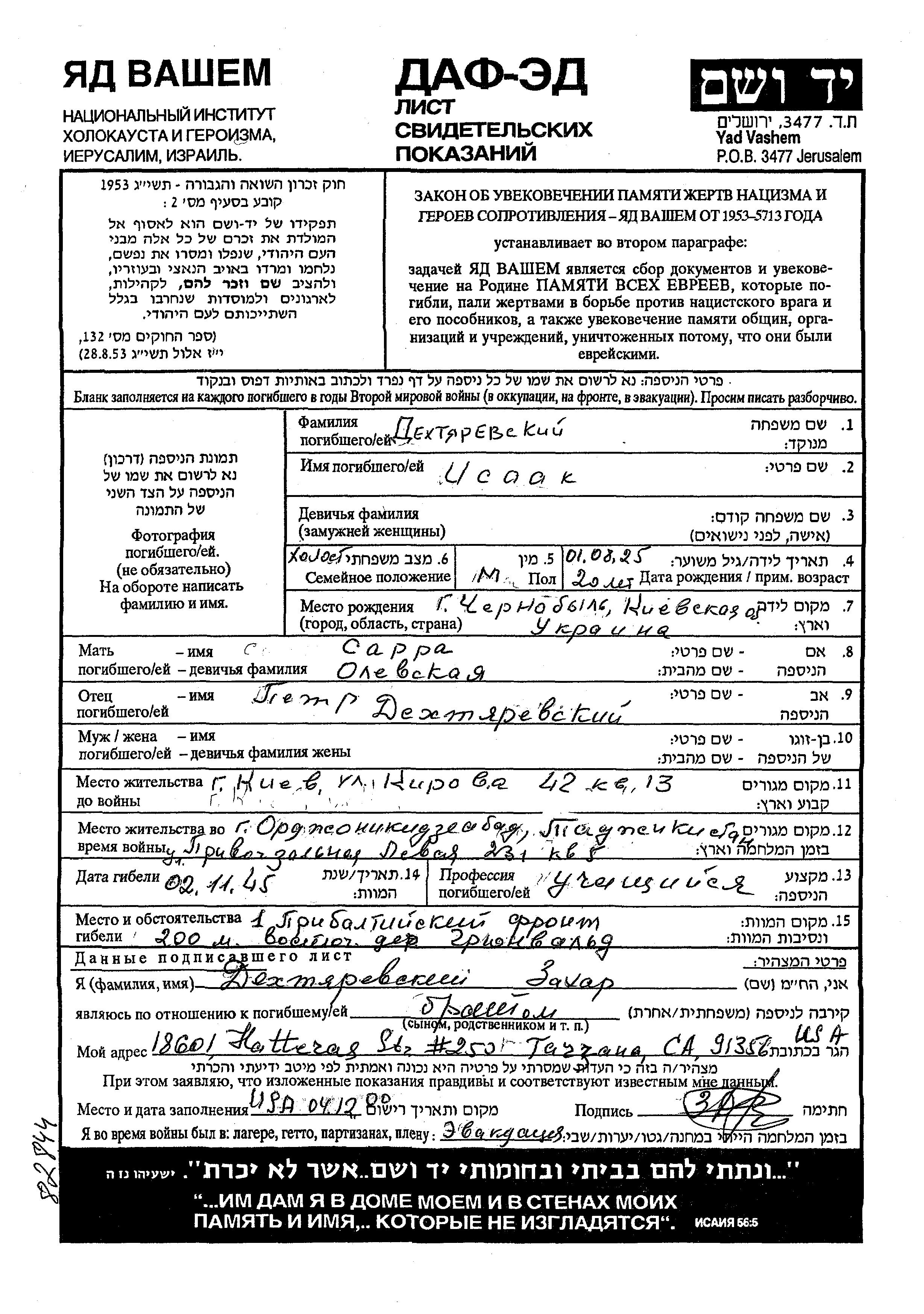 Имя неизвестно Дехтяревский Олевский, место рождения: Чернобыль, Украина (СССР). Отец: Пётр, mать:Сарра. Ученик / ученица. Холост / не замужем. Место жительства до войны: Киев, Украина (СССР). Место во время войны: Орджоникидзебад, Таджикистан (СССР). Погиб на военной службе. место смерти: Грюнвальд, Германия в 1945.