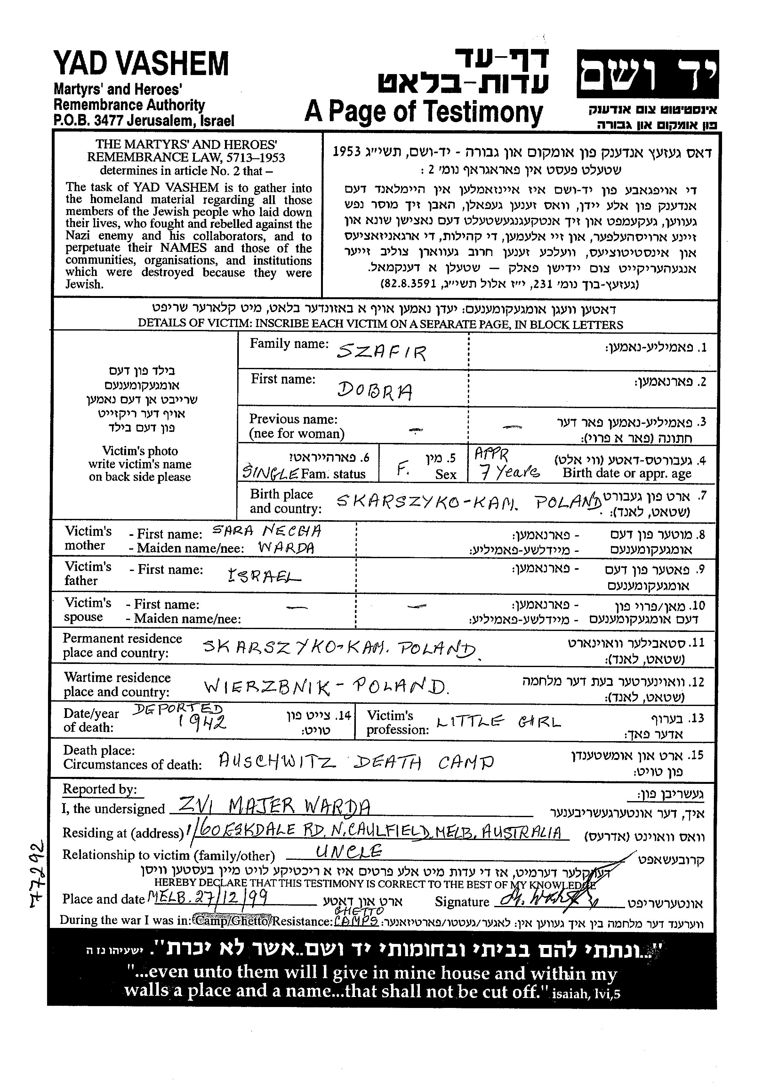 Добра Шафир, место рождения: Скаржиско-Каменна, Польша. Отец: Исраэль, mать:Сара Неха. Ребенок. Место жительства до войны: Скаржиско-Каменна, Польша. Место во время войны: Вежбник, Польша.
