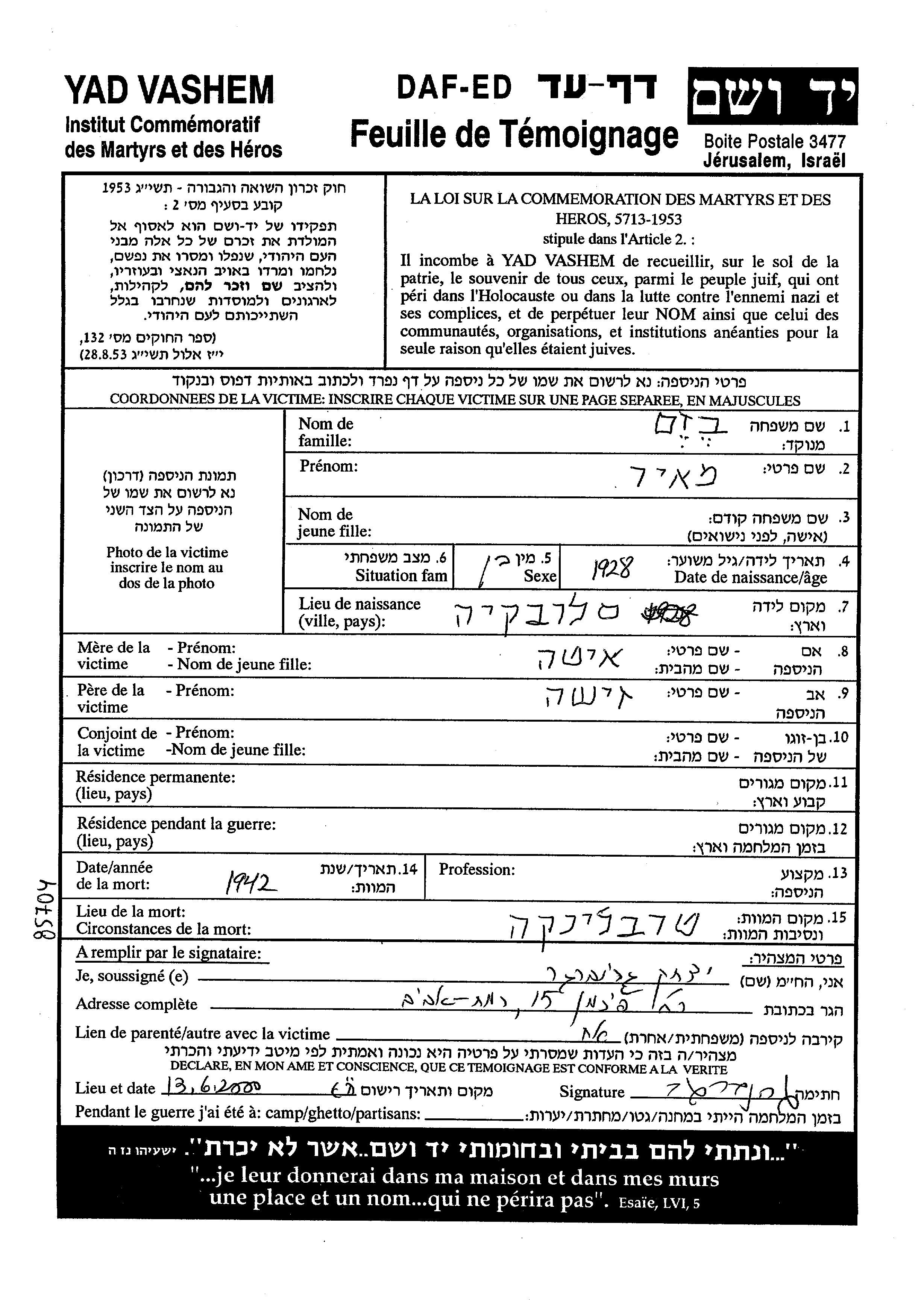Яд Вашем - Листы свидетельских показаний Мемориального фонда