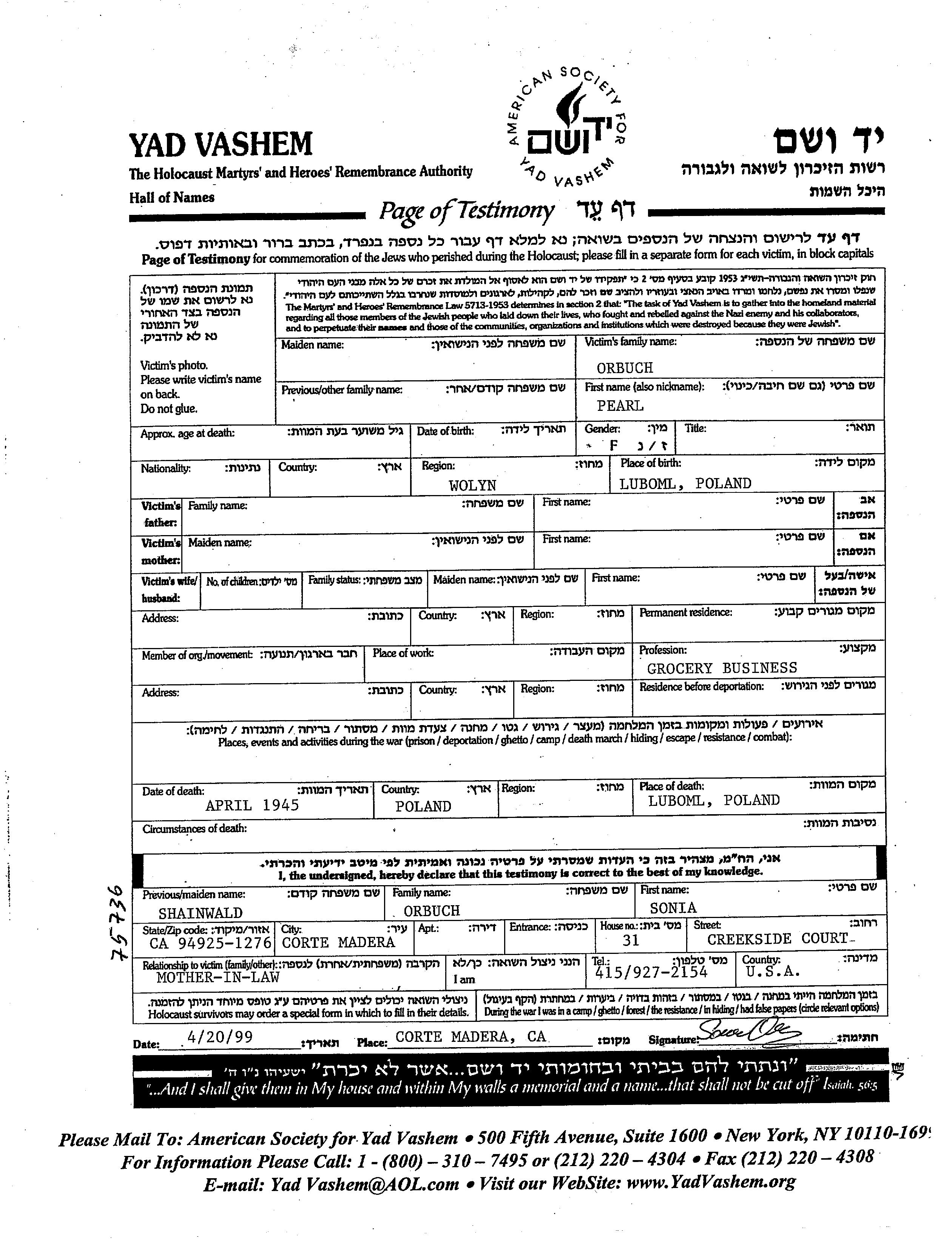 Яд Вашем - Листы свидетельских показаний Мемориального фонда