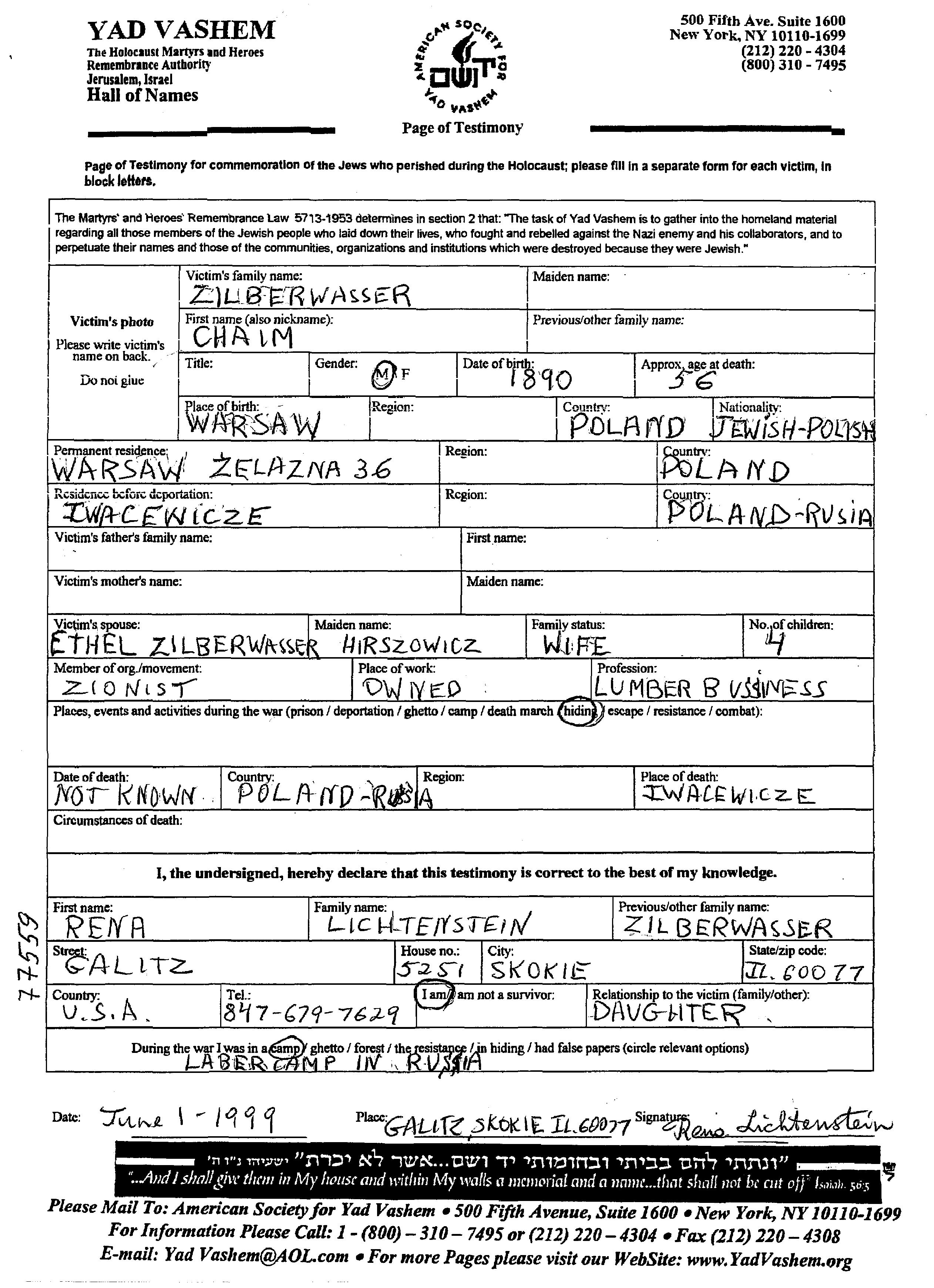 Хаим Зильбервассер, место рождения: Варшава, Польша. Женат / замужем. Место жительства до войны: Варшава, Польша. Место во время войны: Ивацевичи, Польша.