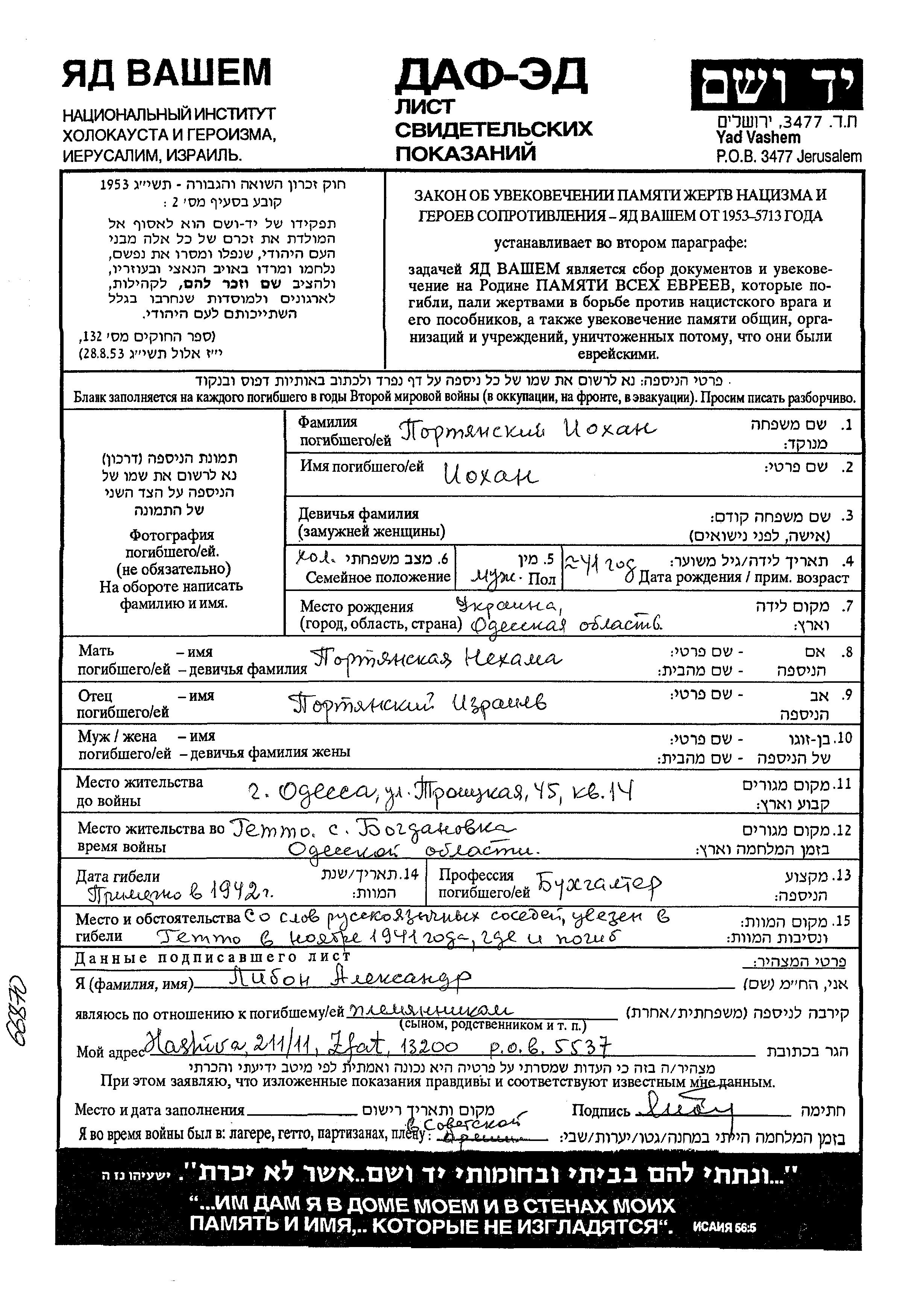 Портянский Иоханан Одесса, Украина (СССР) Лист свидетельских показаний