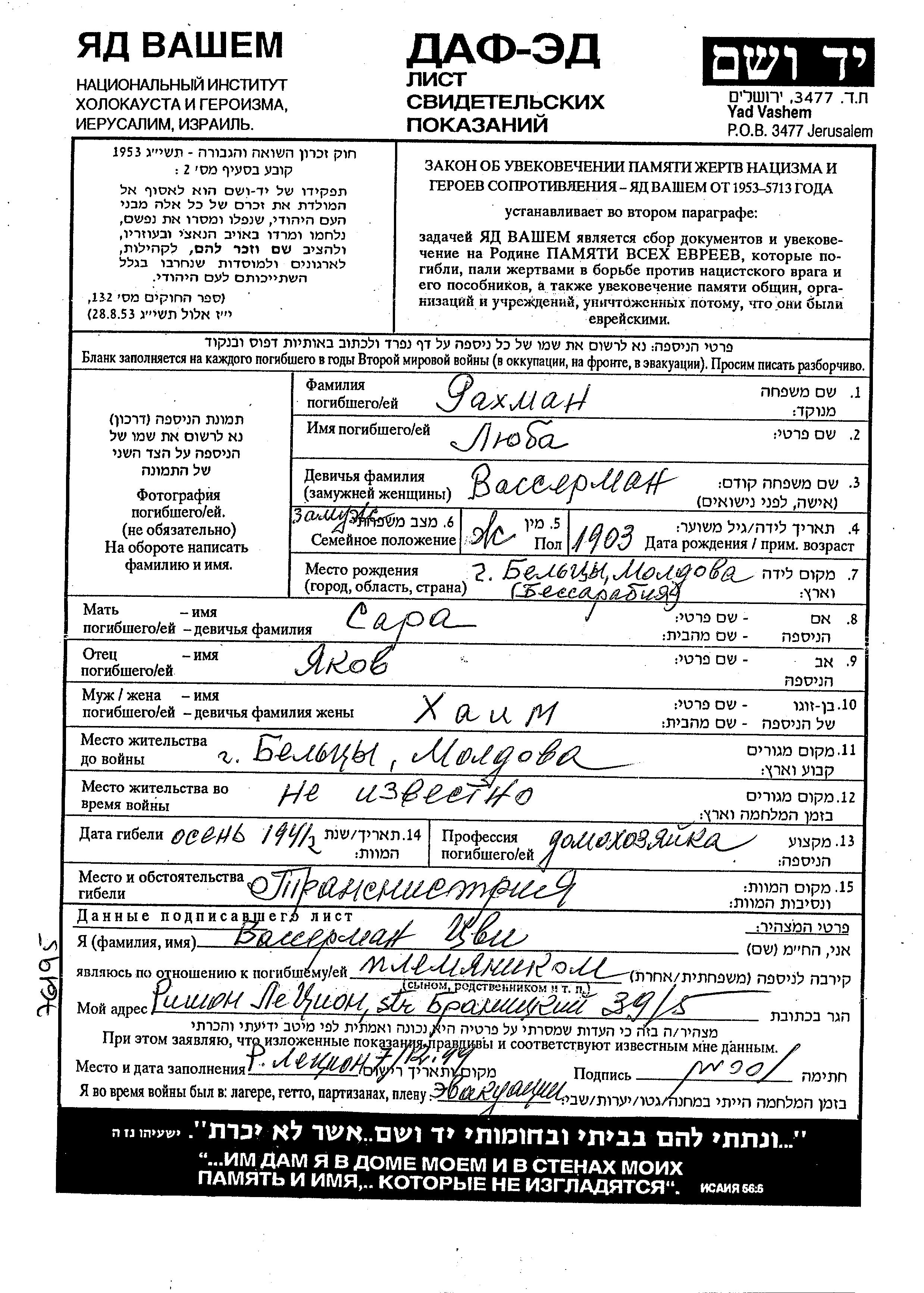 Люба Рахман, девичья фамилия Вассерман, место рождения: Бельцы, Румыния. Отец: Яков, mать:Сара. Домохозяйка. Женат / замужем. Место жительства до войны: Бельцы, Румыния.
