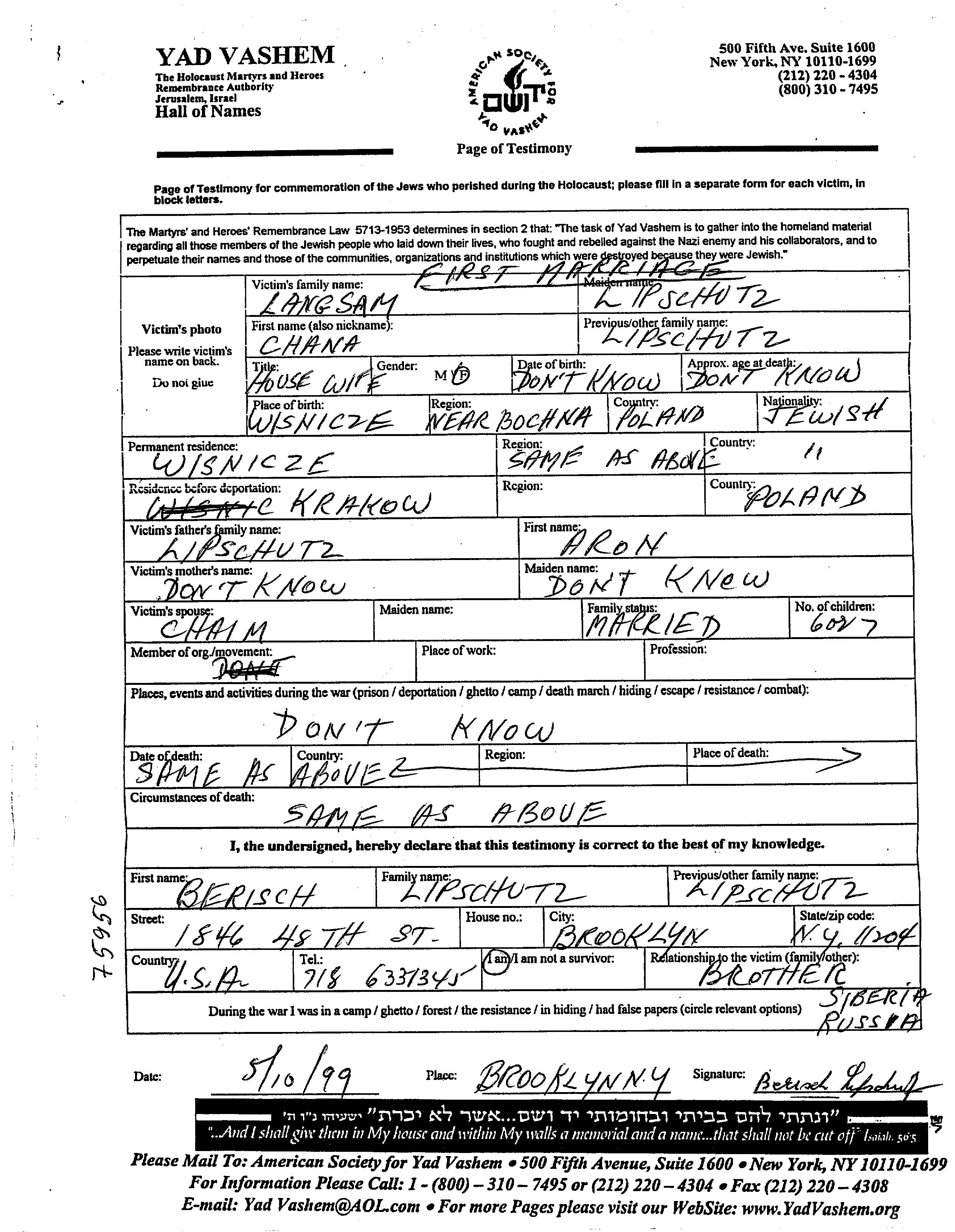 Хана Лангсам, девичья фамилия Липшуц, место рождения: Виснич, Польша. Отец: Арон. Женат / замужем. Место жительства до войны: Виснич, Польша. Место во время войны: Краков, Польша.