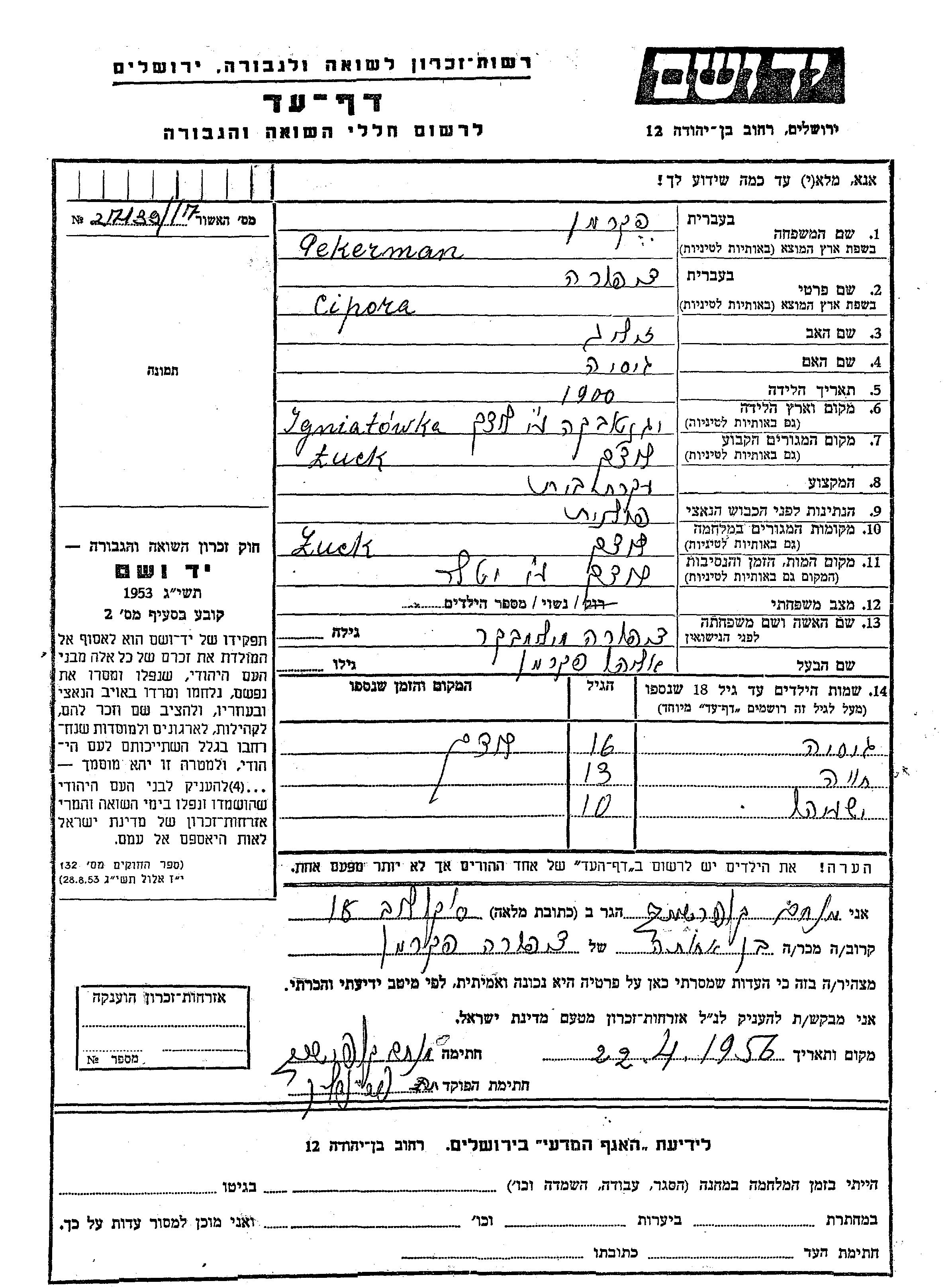 Пекерман Ципора 1900 Луцк, Польша Лист свидетельских показаний