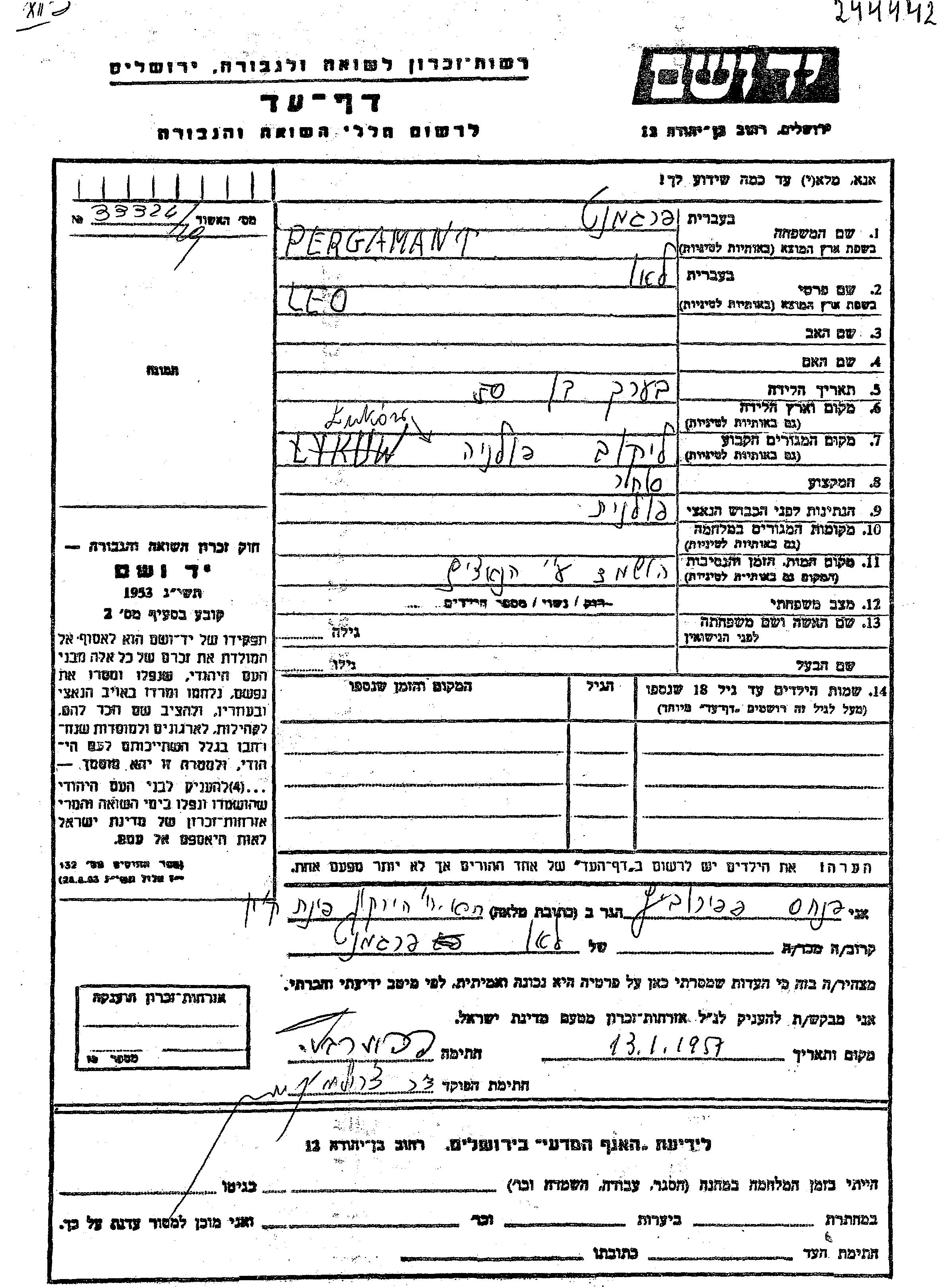 Лио Пергамант, место рождения: Лукув, Польша. Торговец / торговка. Женат / замужем. Место жительства до войны: Лукув, Польша.