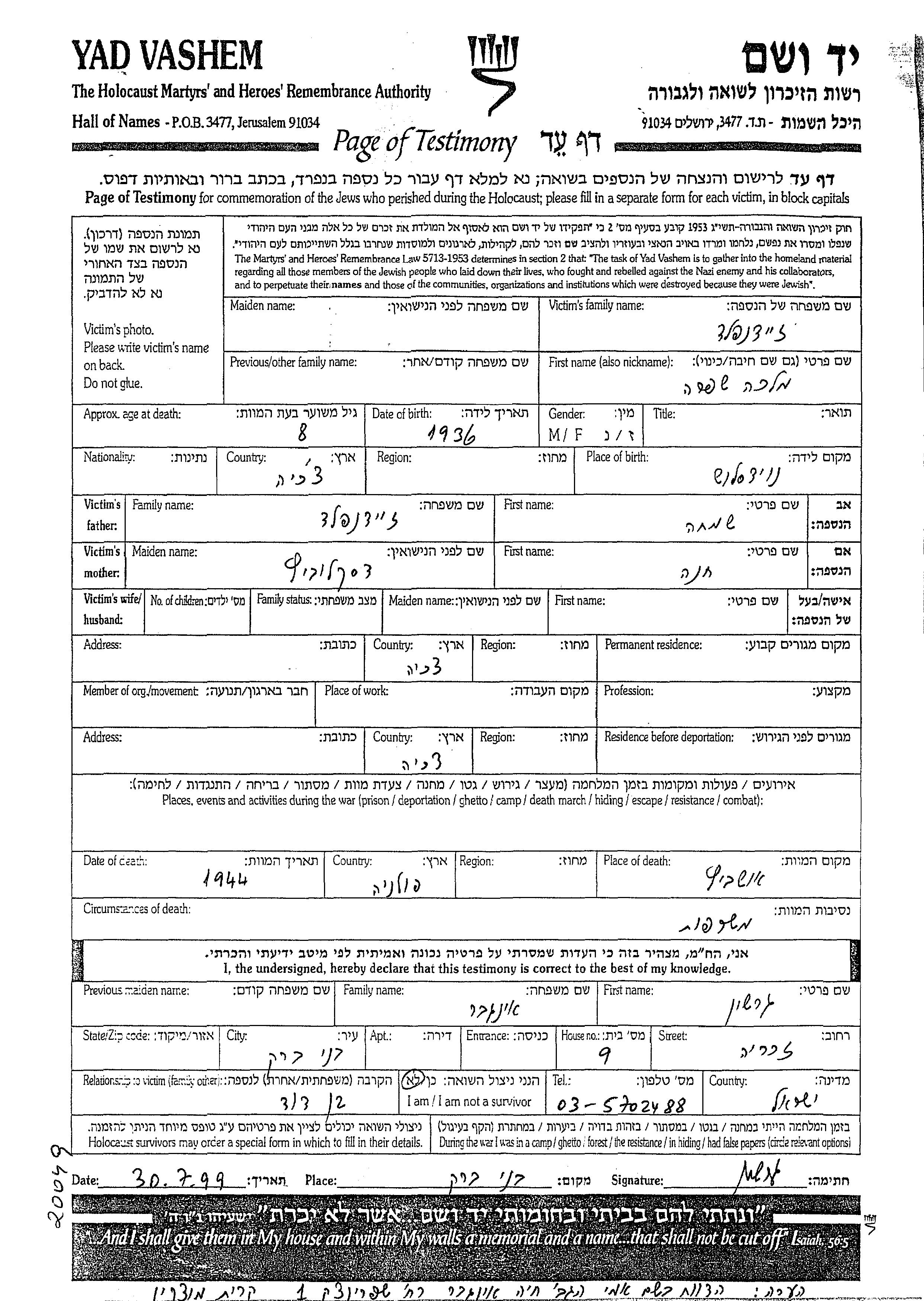 Яд Вашем - Листы свидетельских показаний Мемориального фонда
