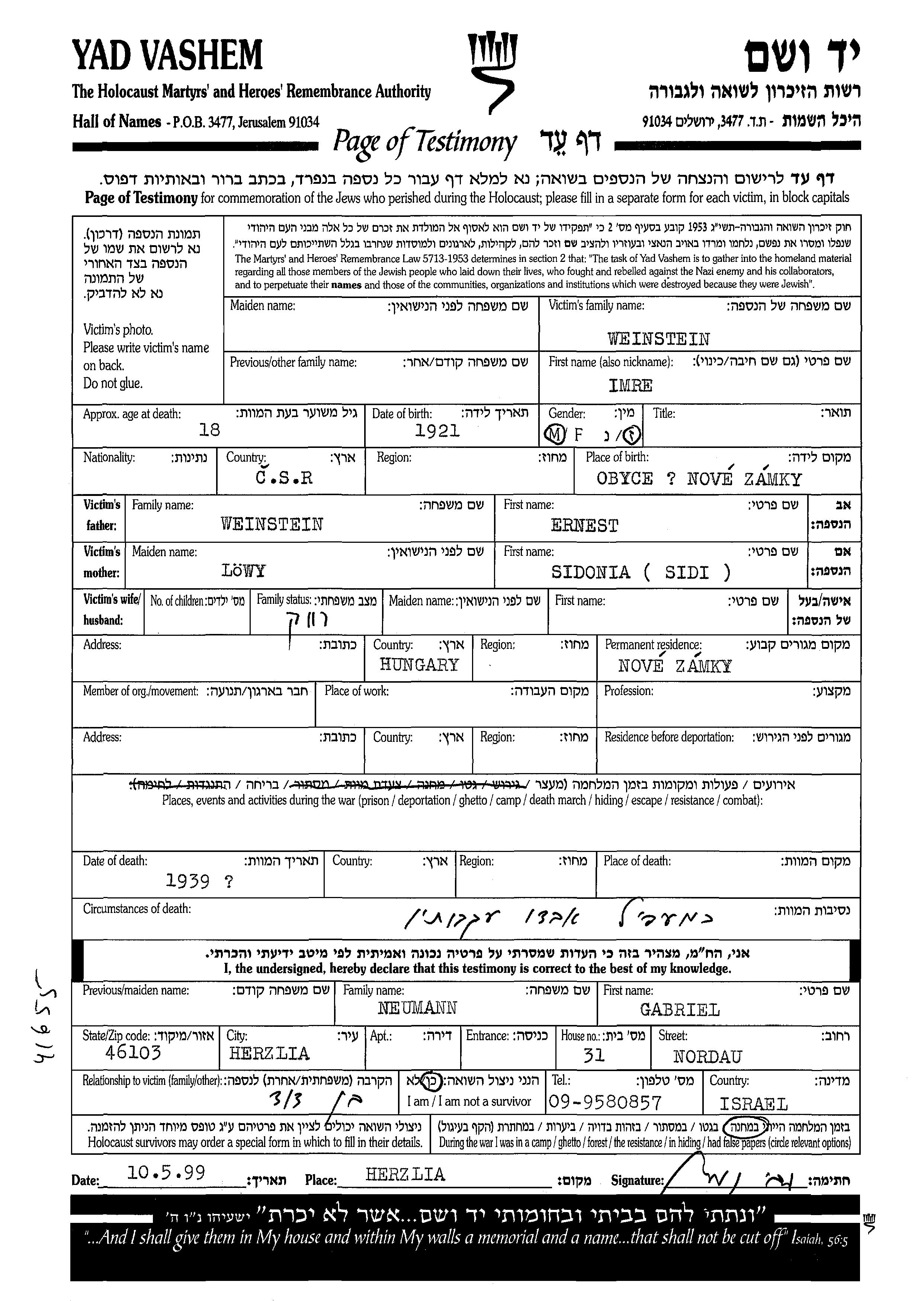 Имре Вейнштейн, место рождения: Нове-Замки, Чехословакия. Отец: Эрнест, mать:Сиди. Холост / не замужем. Место жительства до войны: Нове-Замки, Чехословакия.