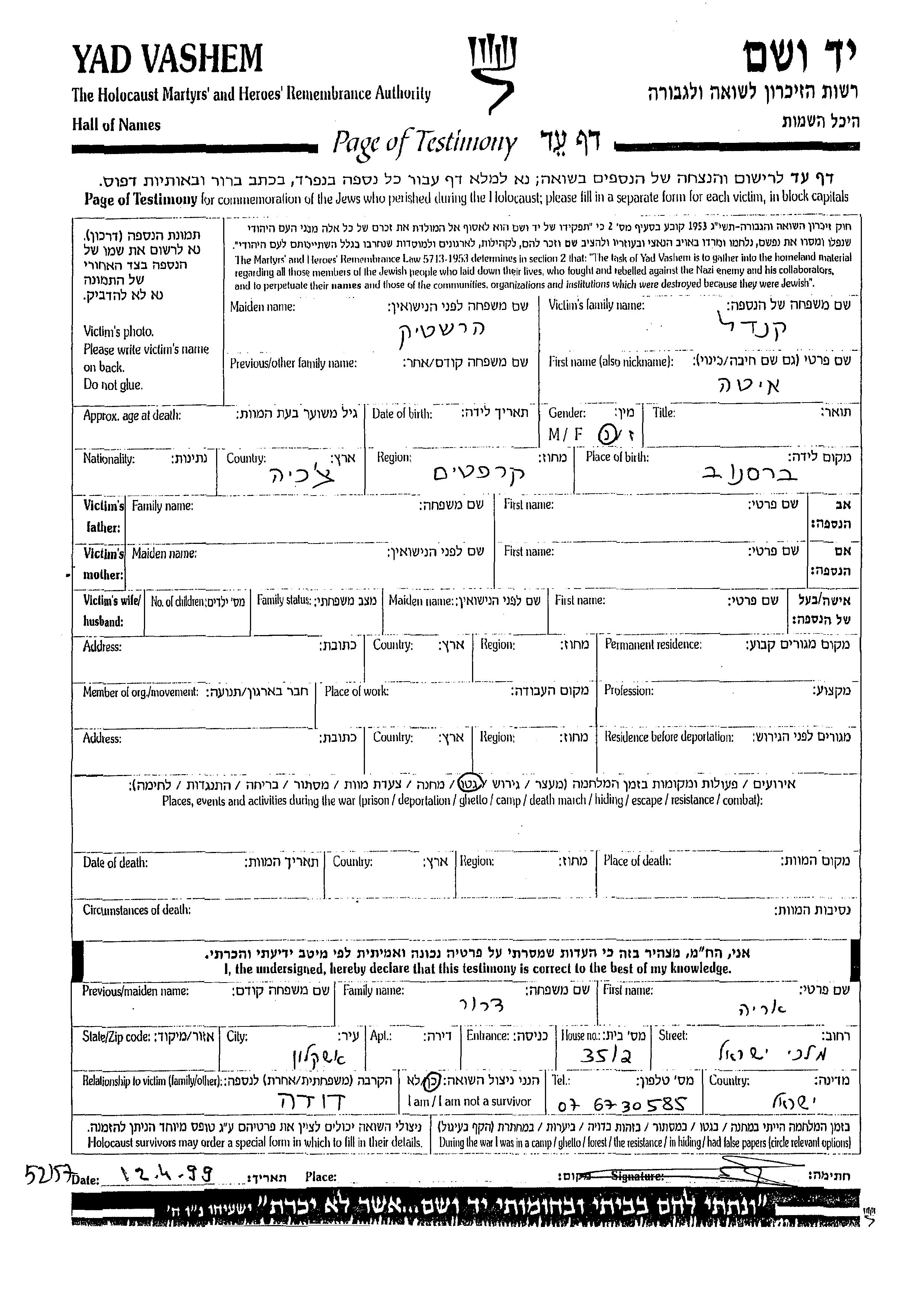 Ита Кандель, девичья фамилия Херштик, место рождения: Бырсана, Румыния.