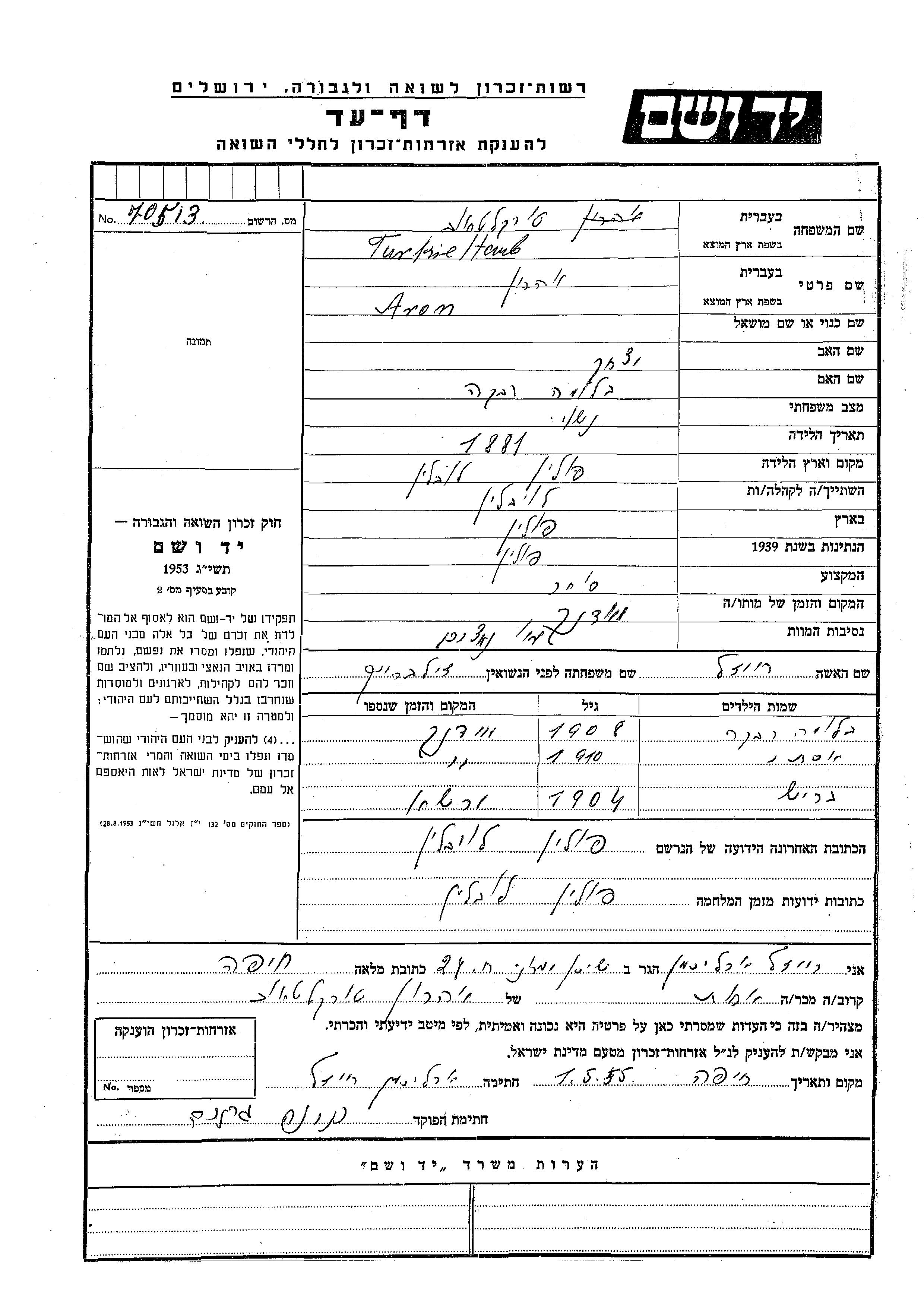 Арон Туркельтауб, место рождения: Люблин, Польша. Отец: Ицхак, mать:Блюма Ривка. Торговец / торговка. Женат / замужем. Место жительства до войны: Люблин, Польша. Место во время войны: Люблин, Польша.