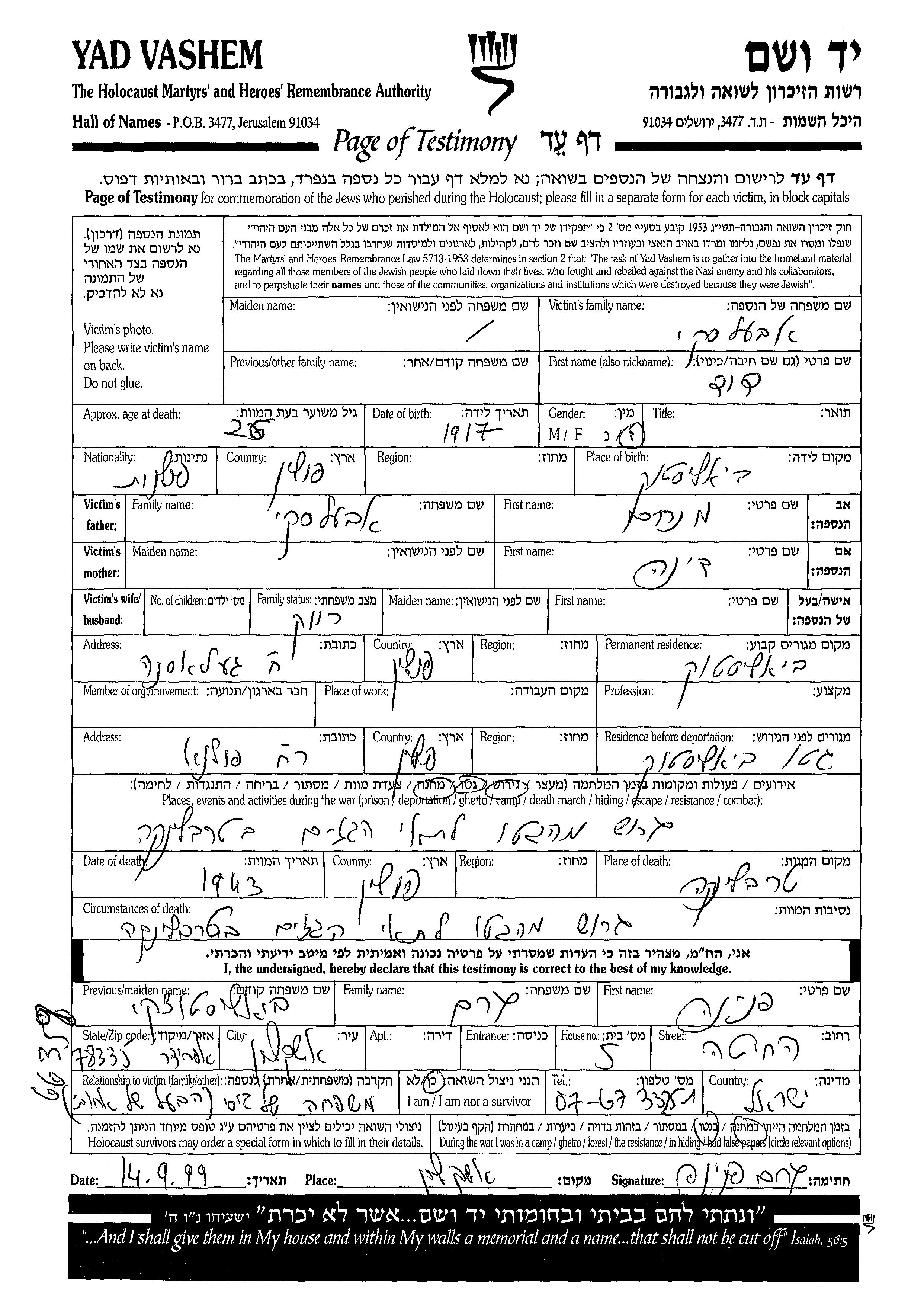 Яд Вашем - Листы свидетельских показаний Мемориального фонда