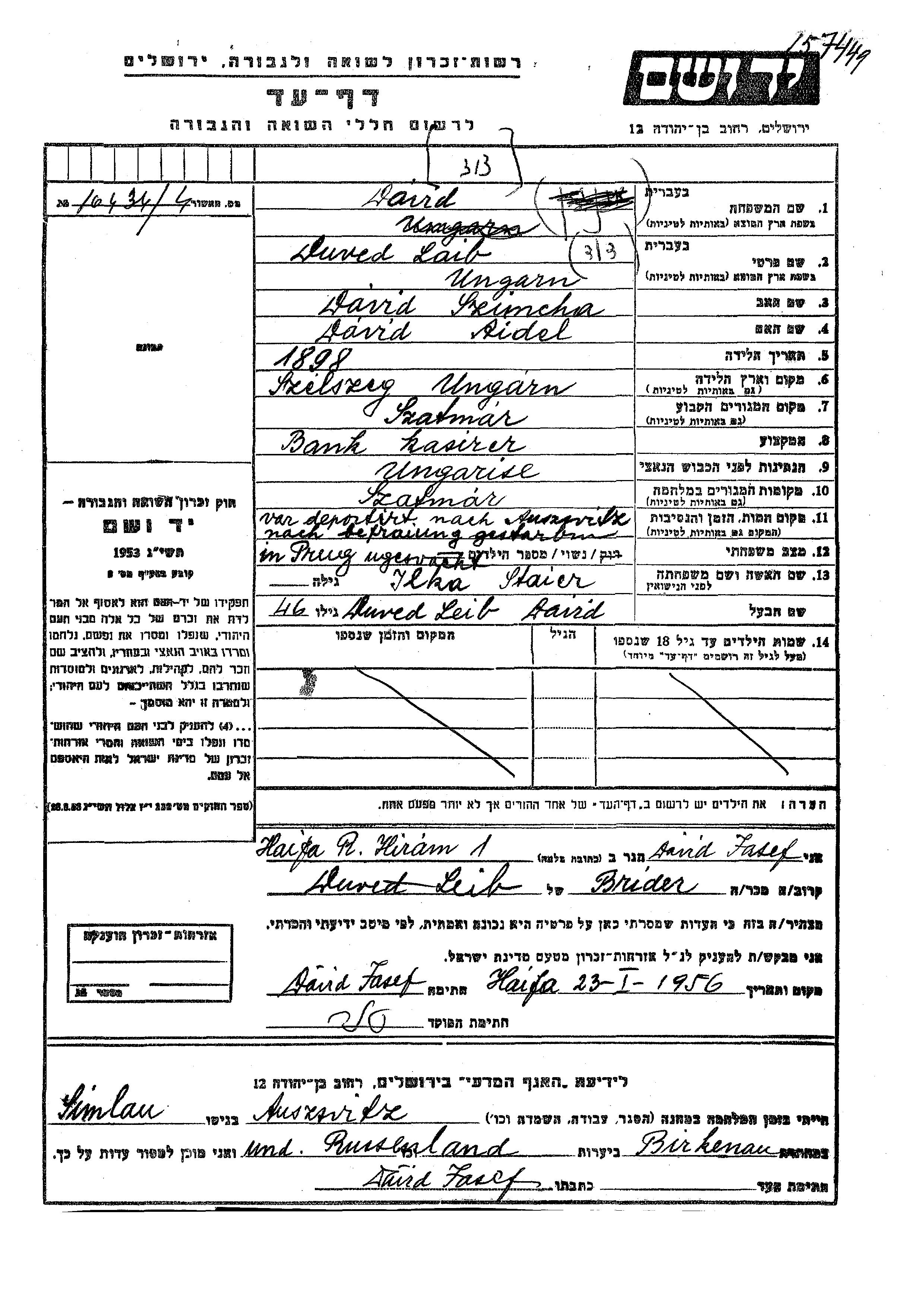 Давид Лайб Давид 1898 Сатмарнемети, Румыния Лист свидетельских показаний