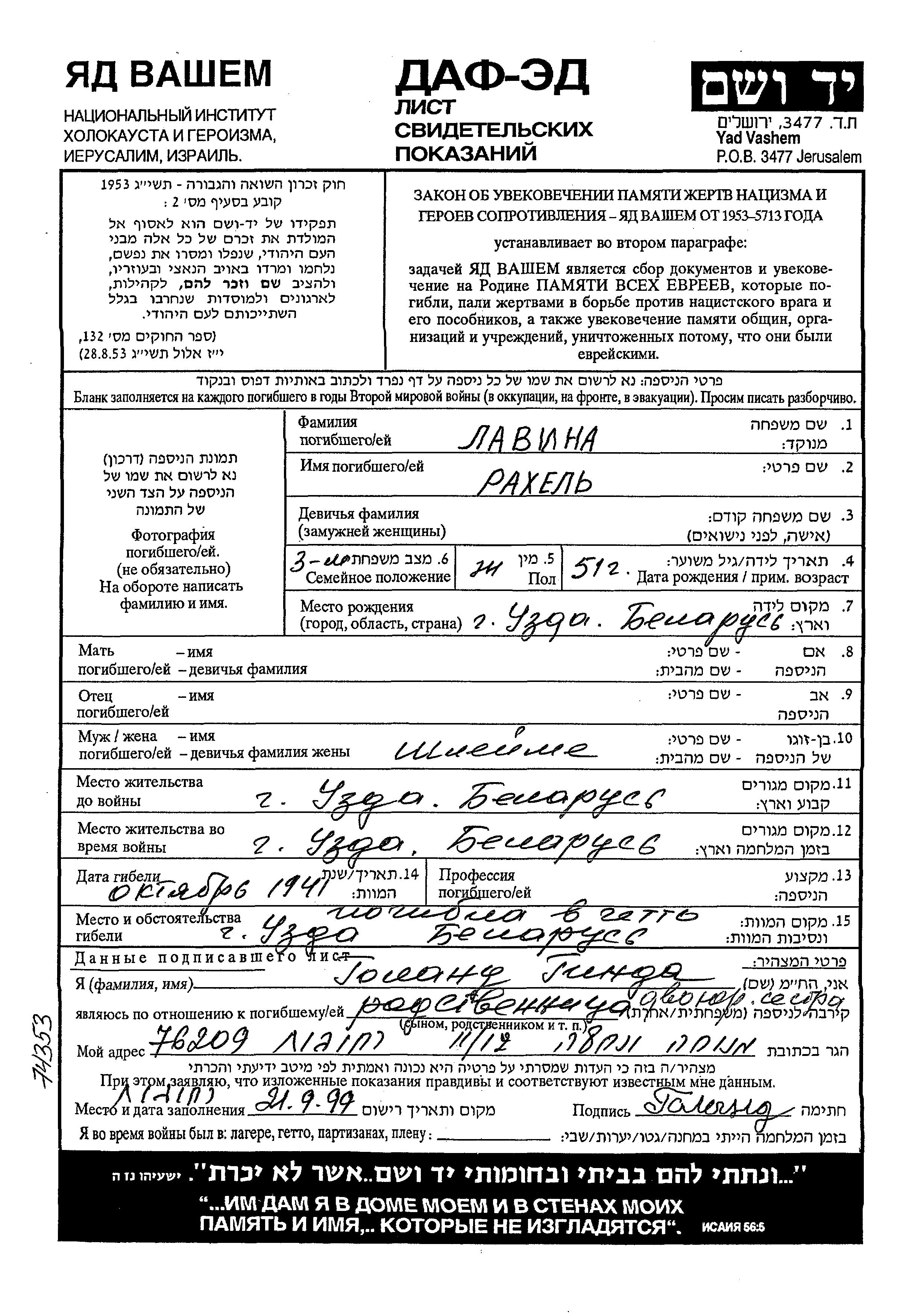 Рахель Лавина, место рождения: Узда, Белоруссия (СССР). Женат / замужем. Место жительства до войны: Узда, Белоруссия (СССР). Место во время войны: Узда, Белоруссия (СССР).