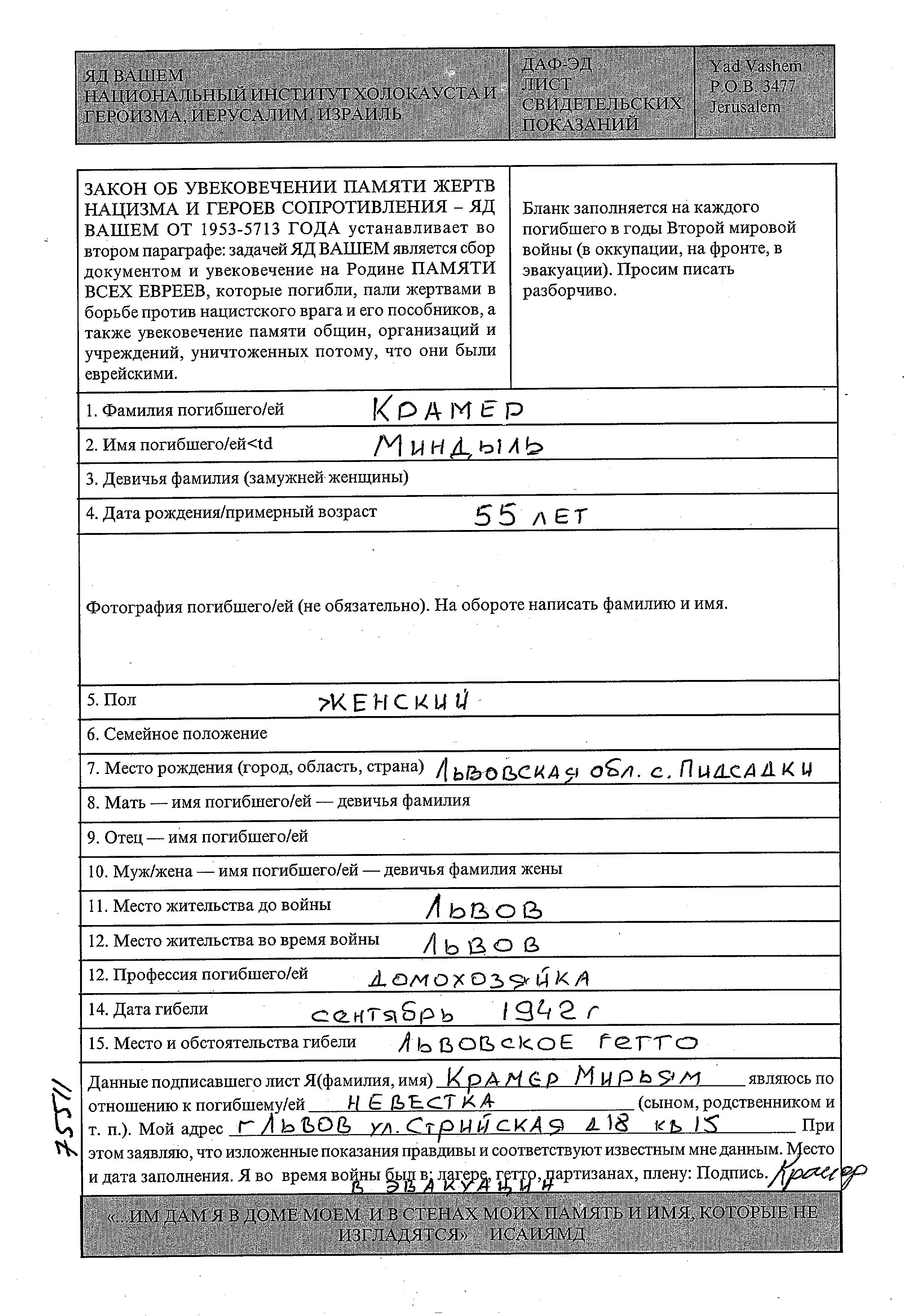 Кремер Миндиль Львов, Польша Лист свидетельских показаний
