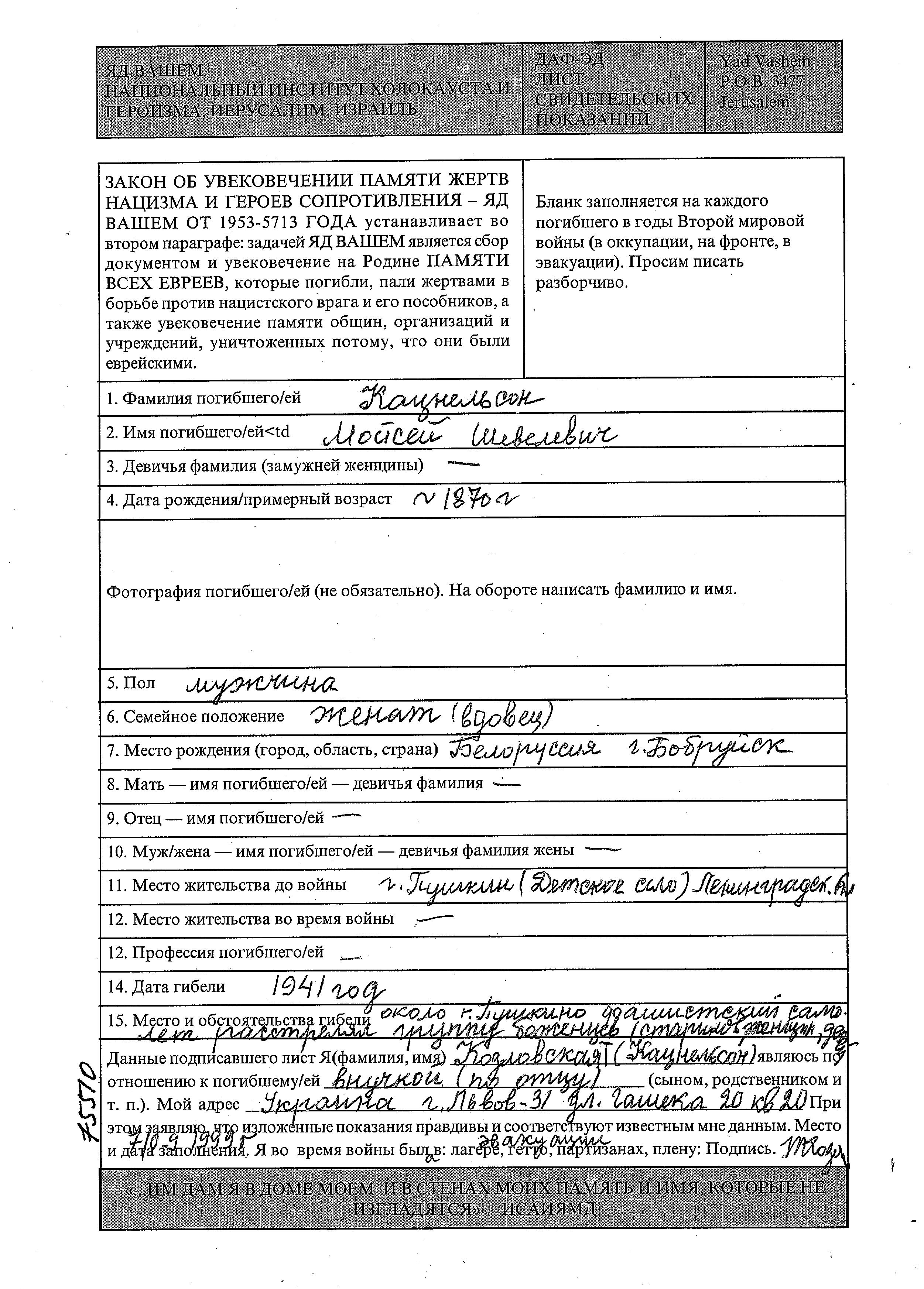 Кацнельсон Моисей 1870 Пушкин, Россия (СССР) Лист свидетельских показаний