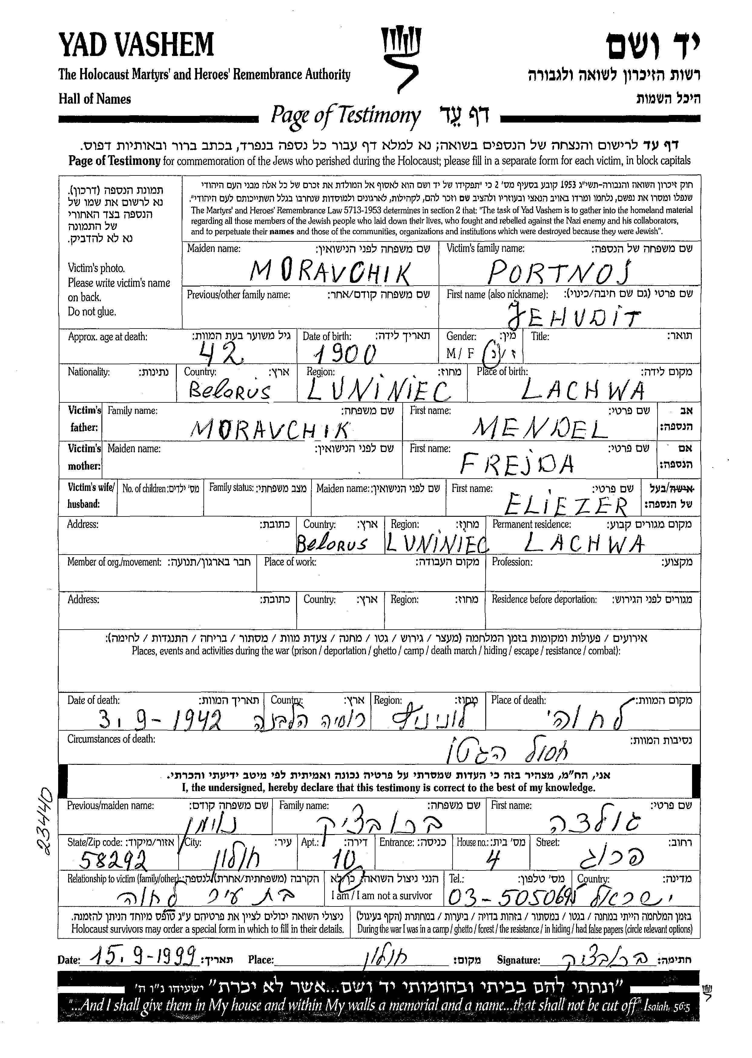 Иегудит Портной, девичья фамилия Моравчик, место рождения: Лахва, Польша. Отец: Мендель, mать:Фрейда. Женат / замужем. Место жительства до войны: Лахва, Польша. Место во время войны: Лахва, Польша.