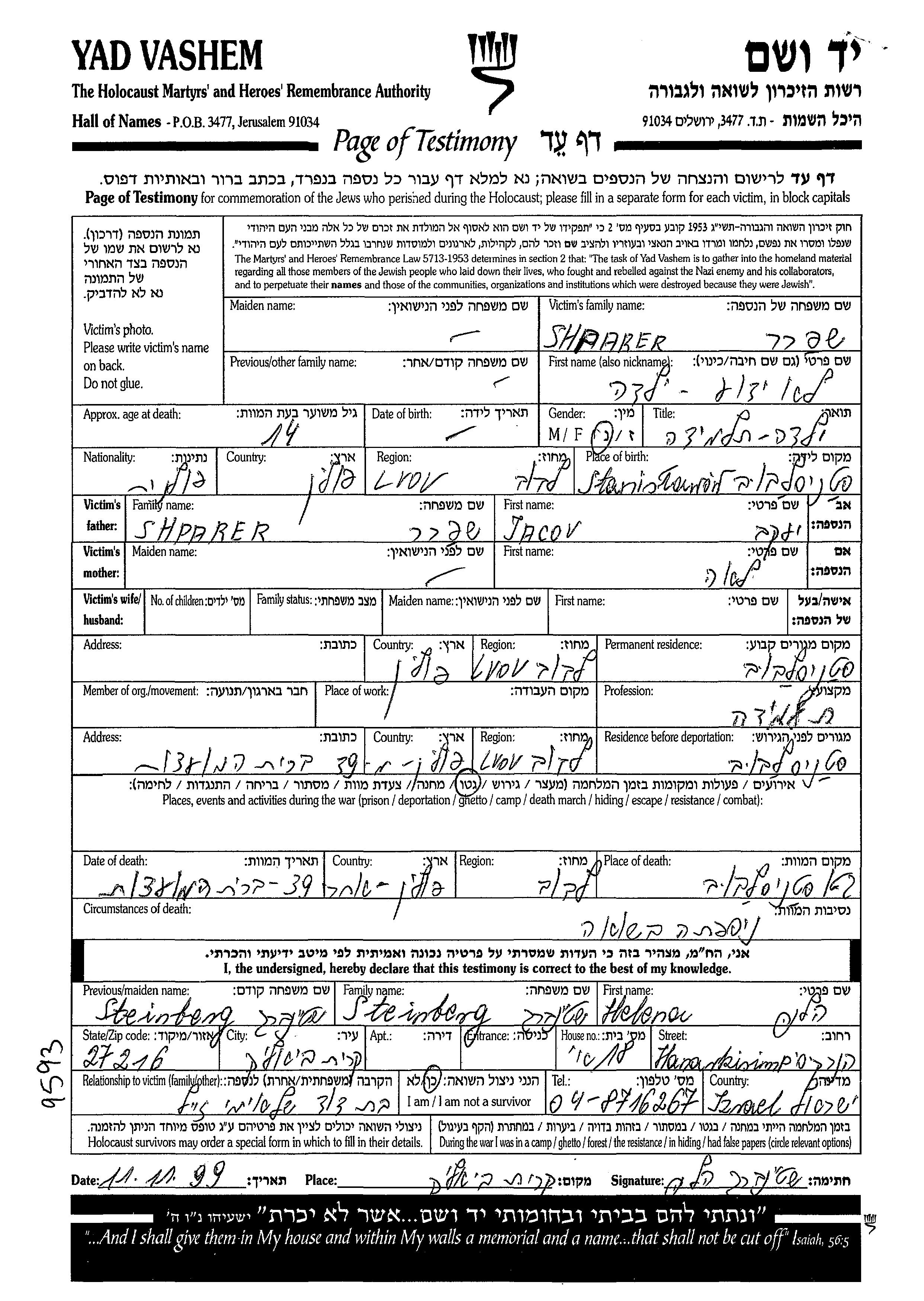 Яд Вашем - Листы свидетельских показаний Мемориального фонда