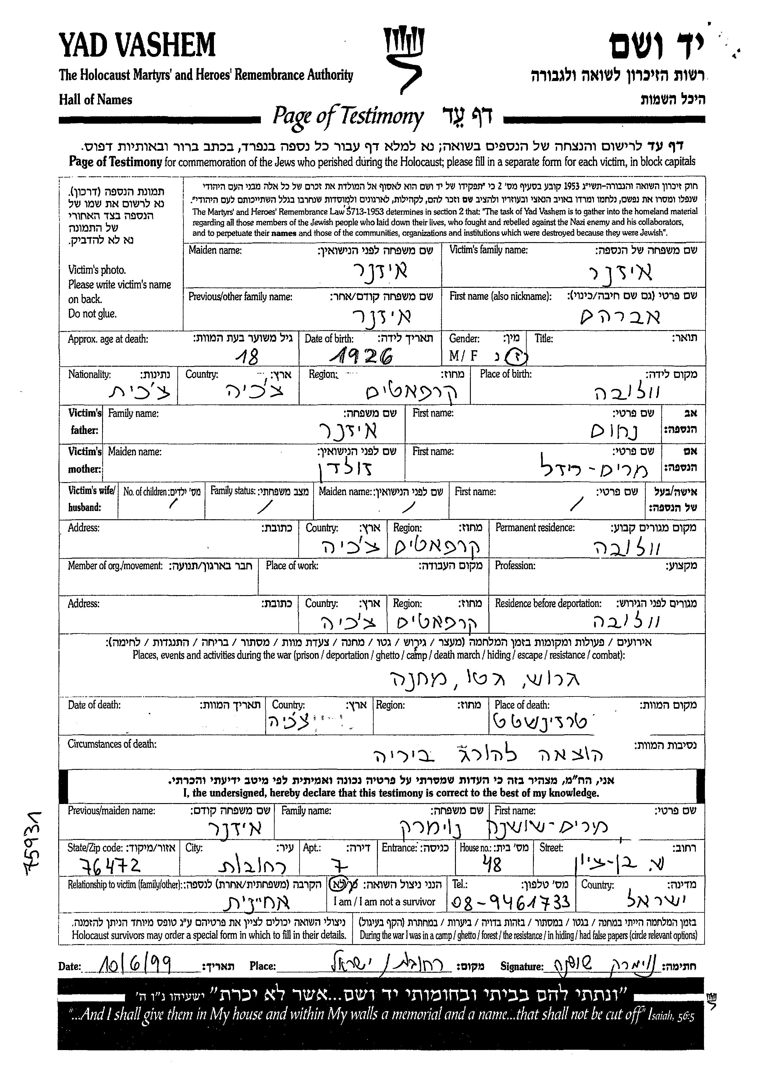 Эйзнер Авраам 1926 Волова, Чехословакия Лист свидетельских показаний