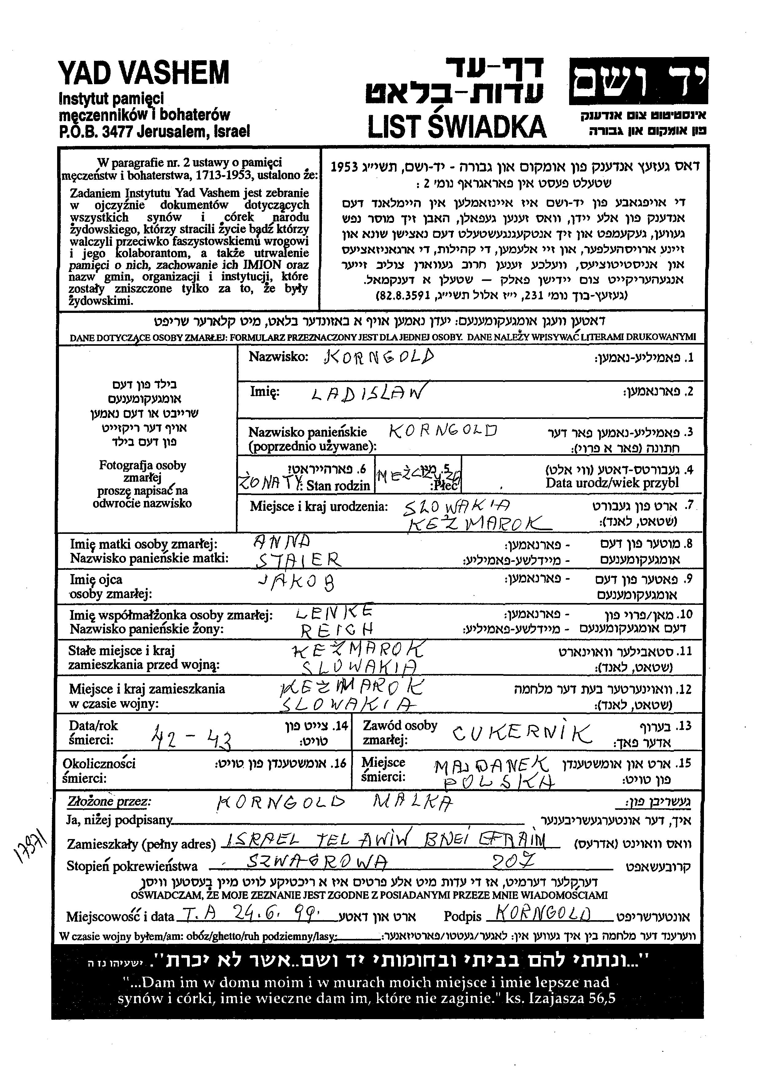 Корнгольд Ладислав Кежмарок, Чехословакия Лист свидетельских показаний