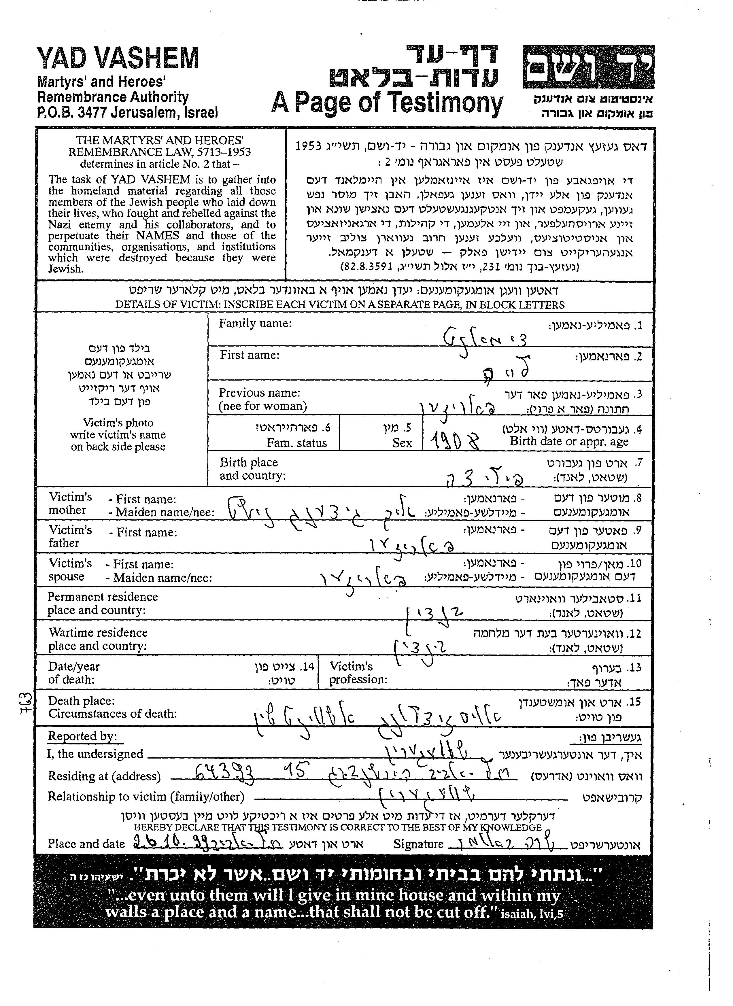 Яд Вашем - Листы свидетельских показаний Мемориального фонда