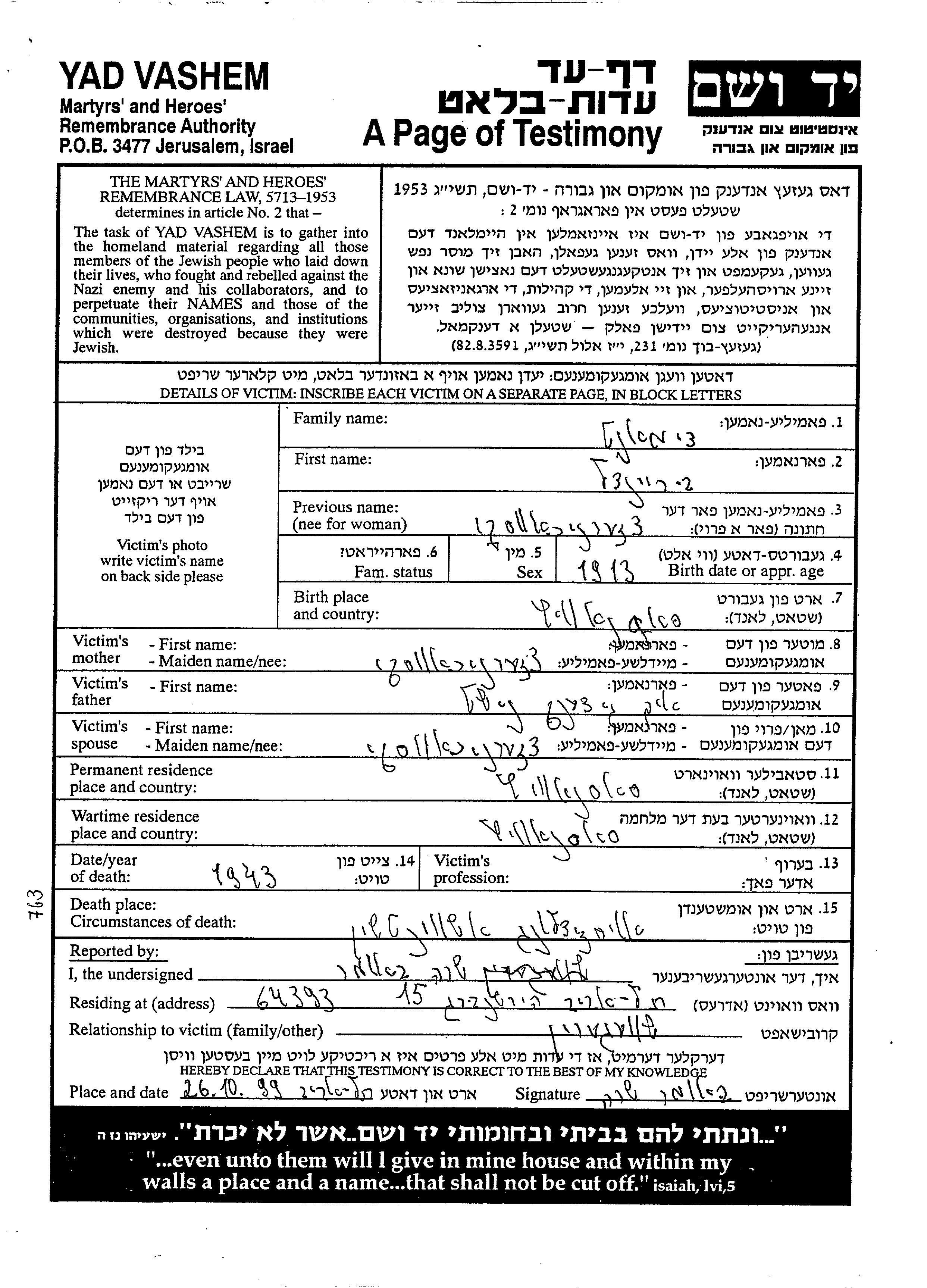 Яд Вашем - Листы свидетельских показаний Мемориального фонда