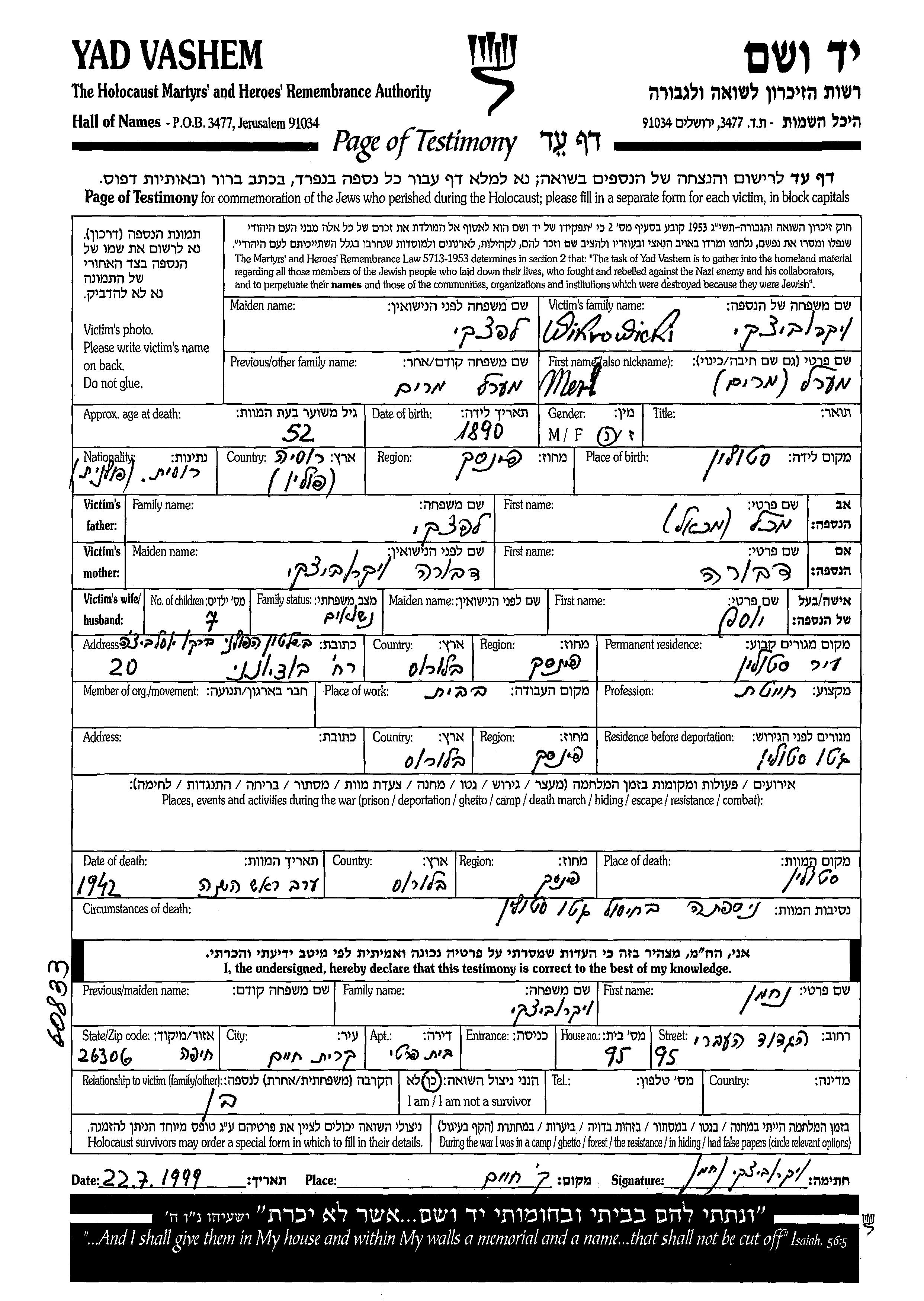 Мерл Викровицки, девичья фамилия Лапецки, место рождения: Столин, Польша. Отец: Мехель, mать:Двора. Портной / портниха. Женат / замужем. Место жительства до войны: Столин, Польша. Место во время войны: Столин, Польша.