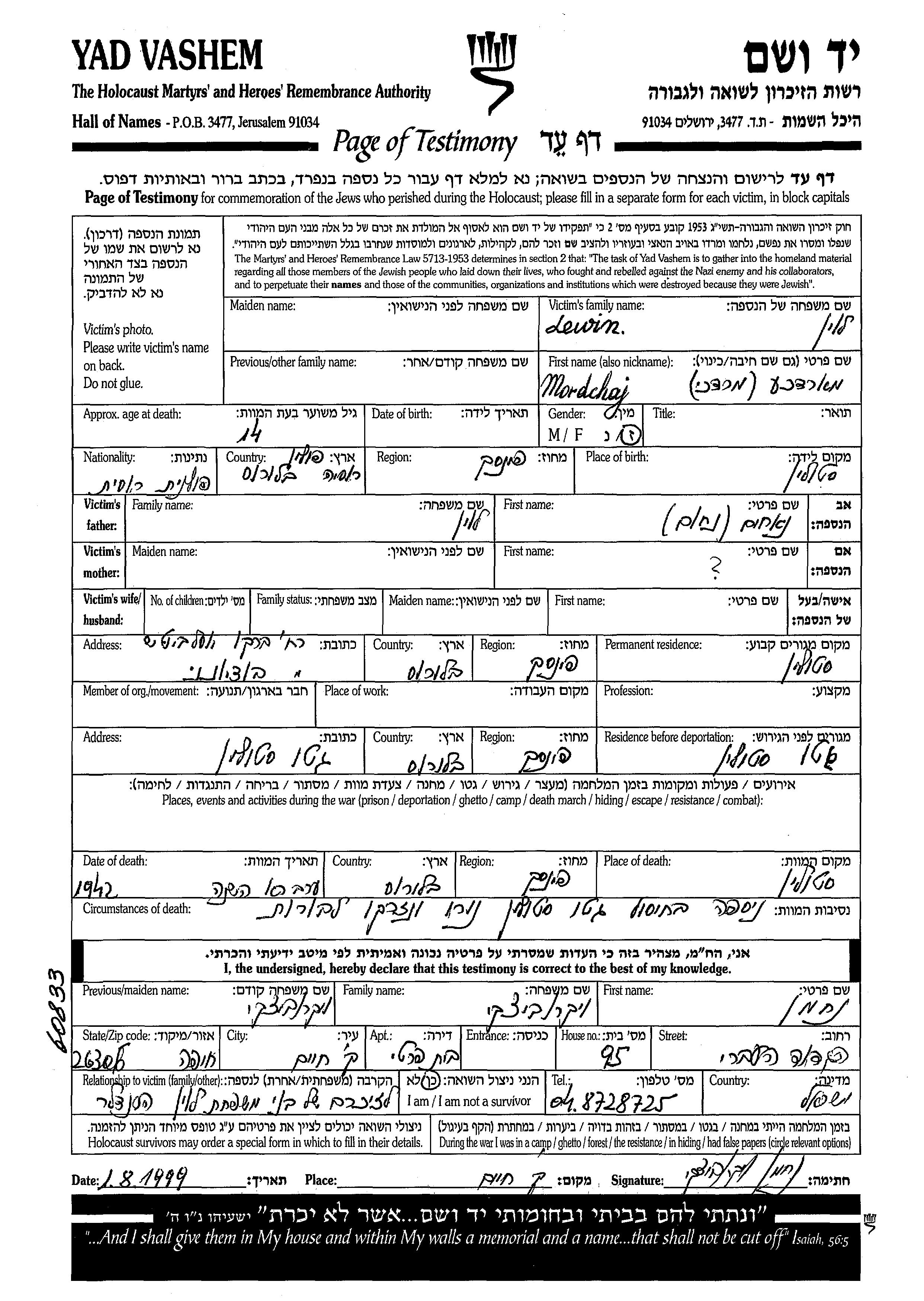 Мордхай уничтожен в период Шоа. место смерти: Столин, Польша в 1942.