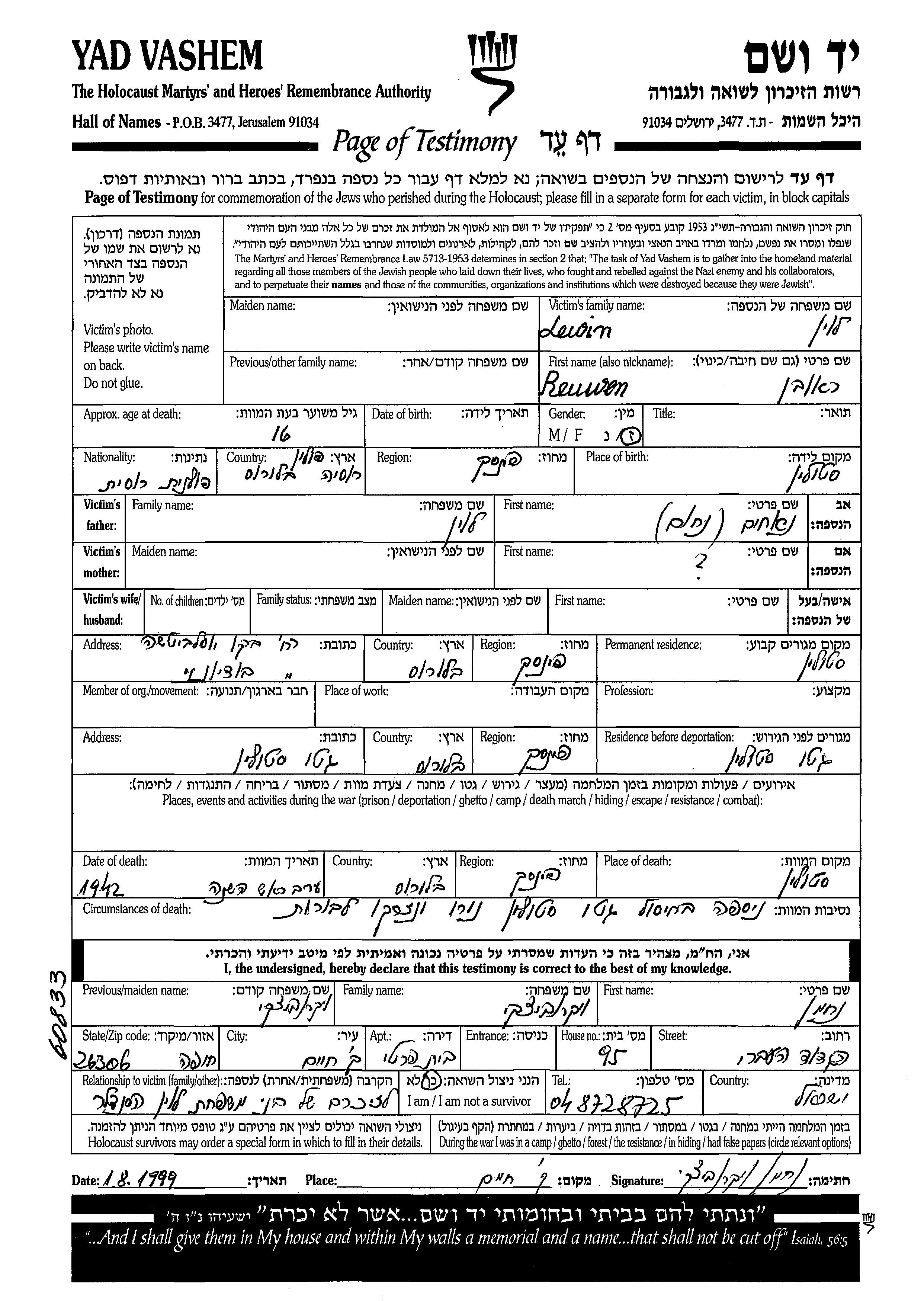 Реувен Левин, место рождения: Столин, Польша. Отец: Нухим. Место жительства до войны: Столин, Польша. Место во время войны: Столин, Польша.