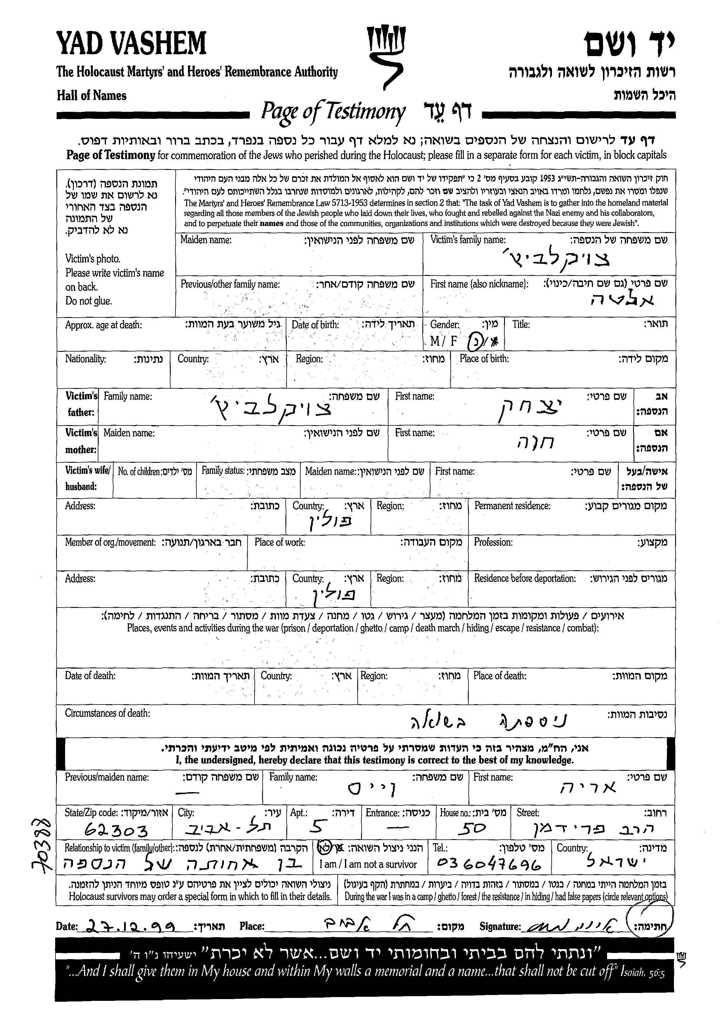 Яд Вашем - Листы свидетельских показаний Мемориального фонда