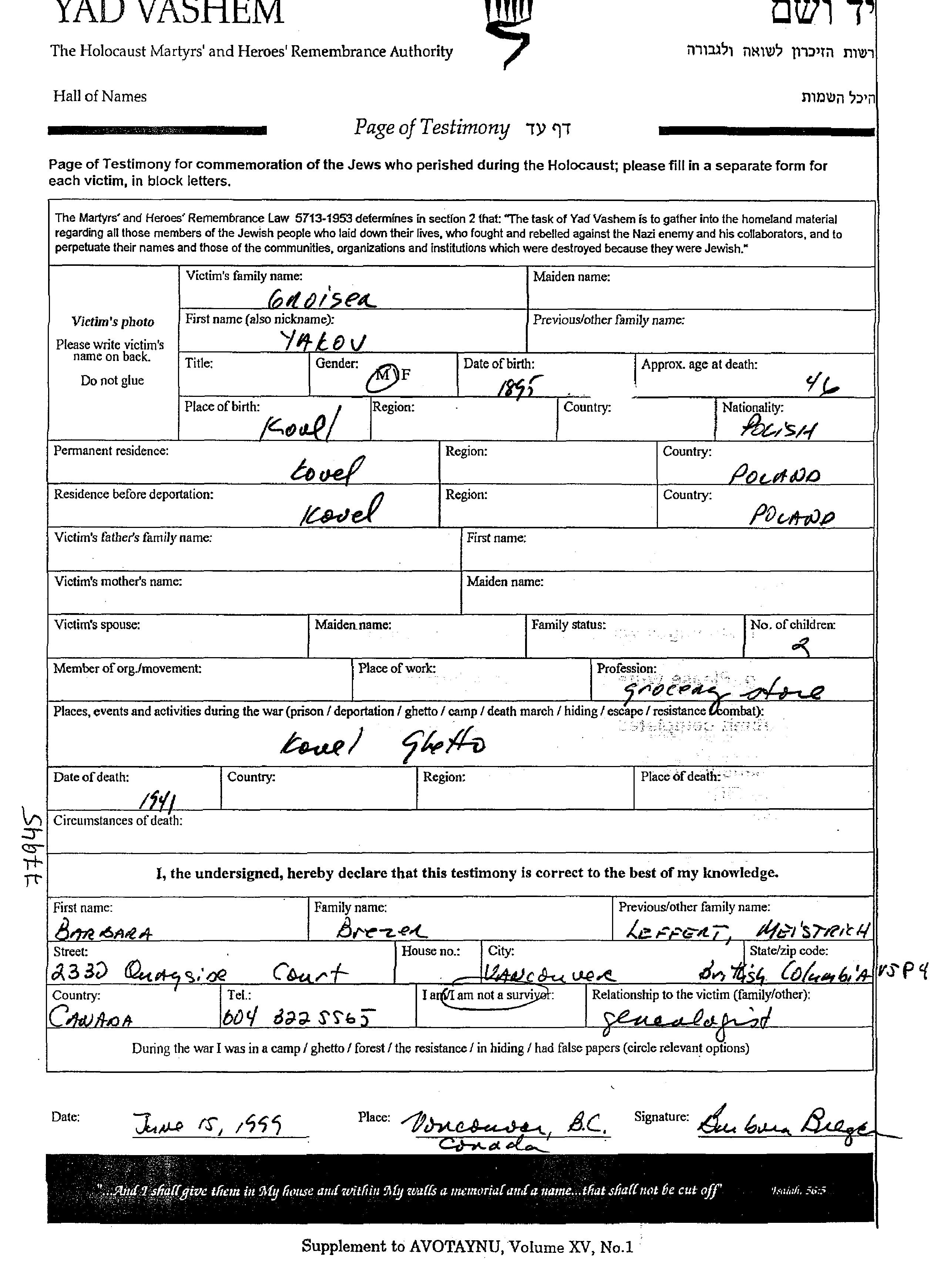 Яд Вашем - Листы свидетельских показаний Мемориального фонда